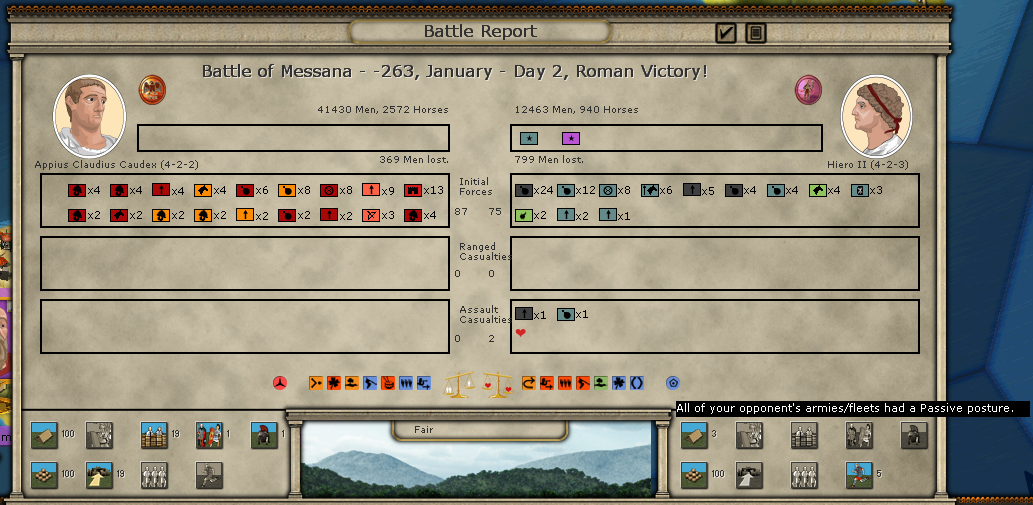 and superiority in men would overcome the Romans defence across a multi day battle. But as the battles progresses he came to realise that the Legionnaires under Claudius's leadership were far more willing to die than surrender. It also represents, to me anyway, that the outcome of the Battle was unsure for both sides until the fourth day. By the look of the last Battle report the tide of battle was beginning to swing in Hiero's favour. But too late for Hiero to see.