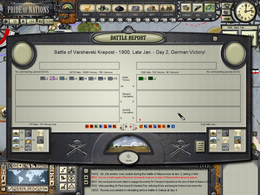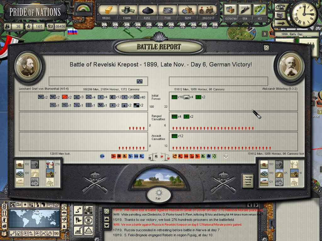 Our armies have crossed the Dvina to take the port city of Riga, the russians had a surprisingly strong army there and the Battle was harder than I had expected it to be, but Blumenthal impetus was unmatched here, besides our guns superiority in every battle now gives us an edge over the russians, there are still some russian forces in Riga, but they're greatly weakened from the battle and the way is almost open for our next thrust towards Saint Petersburg.