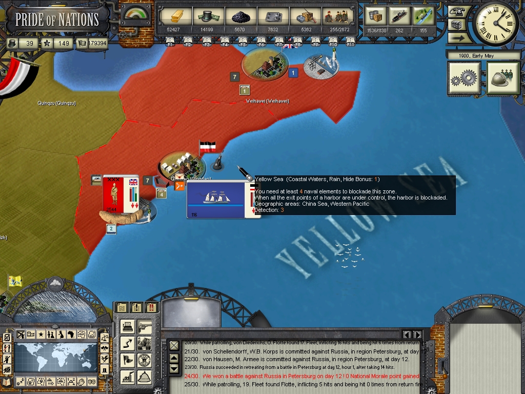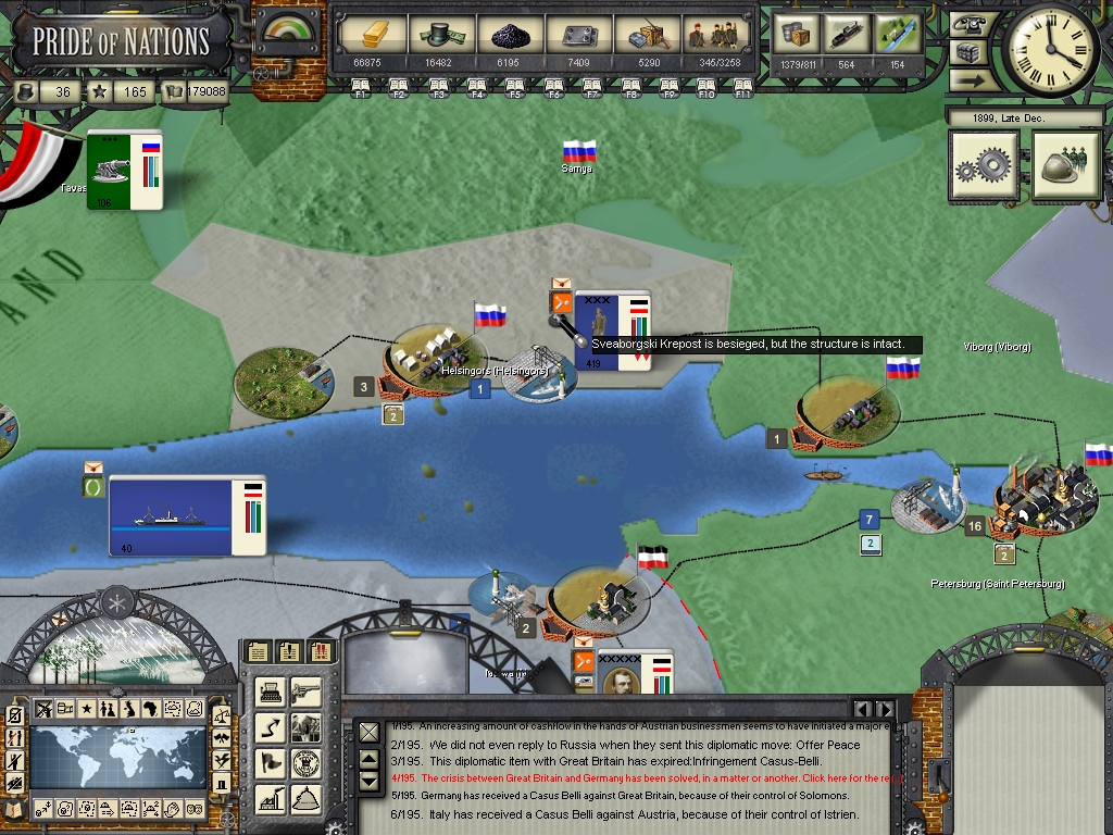 We have commited Marshal Waldersee against the russian forces in Saint Petersburg, as with the situation deteriorating against the british we need to force the russians into submission the faster way possible, Waldersee's forces met some resistance when advancing into the territory lost to the russians in the Battle of Saint Petersburg, the russians tried to hold the positions they obtained from the battle, but in the end they couldn't resist the thrust of the third army with our most experienced troops. So we're now again besieging Saint Petersburg, while our marine forces coming from Finland under Bronsart von Schlleffendorf captured several strong positions in Viborg, further isolating the russian capital.