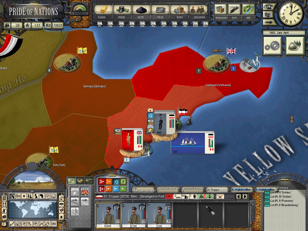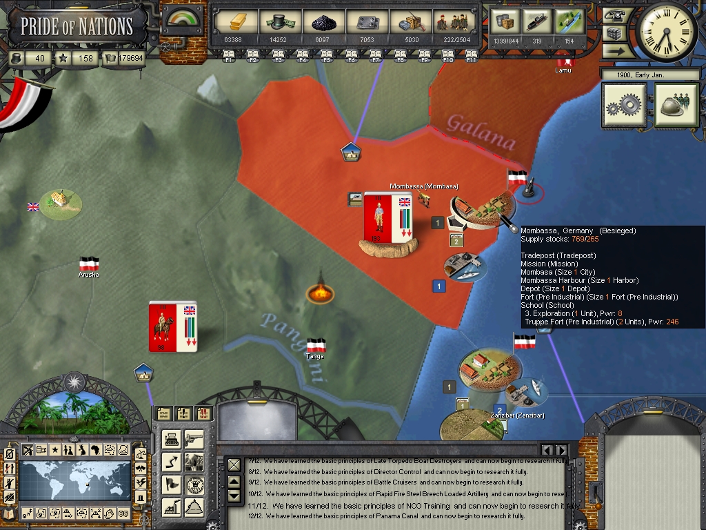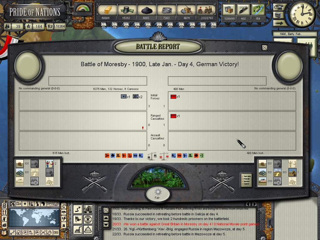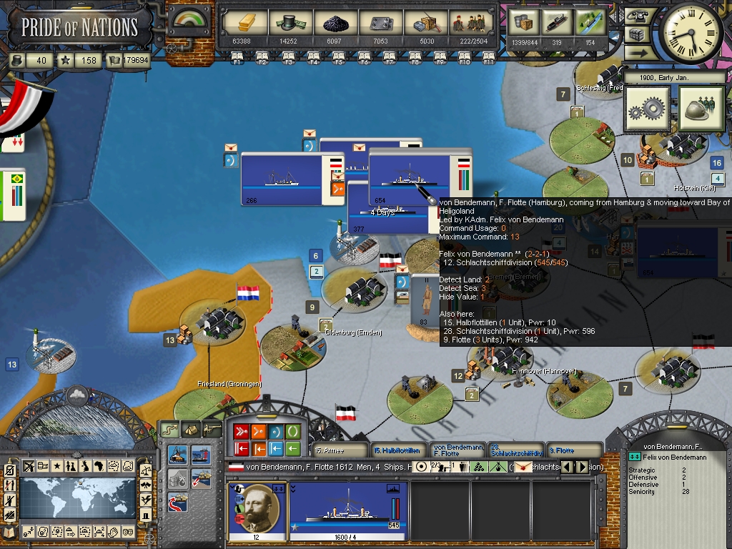 The war with the british was unexpected, a crisis emerged and I chose to let the ai play the crisis cards for me, and the crisis went out of control, anyway Loki commented that by looking at the crisis intensity at the start of the crisis (87) it would be very hard to avoid war. The british are giving me a lot of headache, they have a powerful navy and they are wrecking havoc in my merchant fleet everywhere, besides I'm finding it very dificult to fight them in our colonies around the world. It's a great challenge to fight them, Italy and Austria didn't move a straw to help me until now, but anyway there's little Austria can do to help me, as they don't have oversea territories and their navy isn't nearly enough powerful to threat the british anywhere, but Italy could give us a hand in the mediterranean sea...