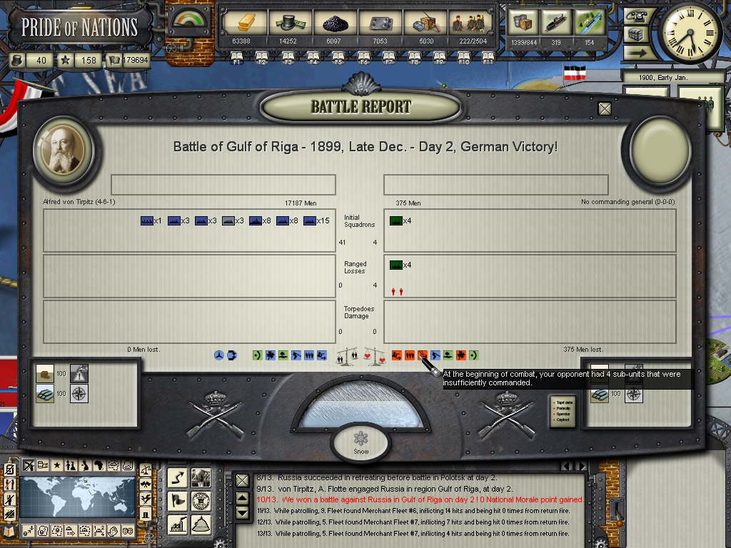 The winter in Russia has come prematurely this year, this is trully bad news, Saint Petersburg is in sight, but the last thing we want now is to give the russians time to rebuild their forces, and a harsh weather could force us to do that. We have suffered heavy losses in two failed attempts to assault the russian fortifications in Minsk, their forces are deeply entrenched there and the weather doesn't help.