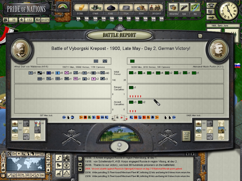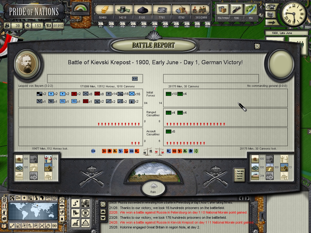 Unfortunately I think I can't use my last reserves in Germany in such a gamble into Great Britain, if I did so the french could be convinced that they could invade Germany, and I would definitely colapse if the french enter this war, this war is really stretching me (sometimes even mentally as a player :bonk :) to the limit, although I can say that at least the russians have no more backbone to resist throughout this Summer, the war in Russia will be over within a month or so, they cannot hold anymore, their armies are in a pitful situation, only militias and partisans, they surprised us in our failed assault against Saint Petersburg, but then again it was only because they were fighing inside that huge fortification complex and I commited the mistake in trusting an assault could force them to surrender, but outside their "walls" their forces are in a really deplorable condition.