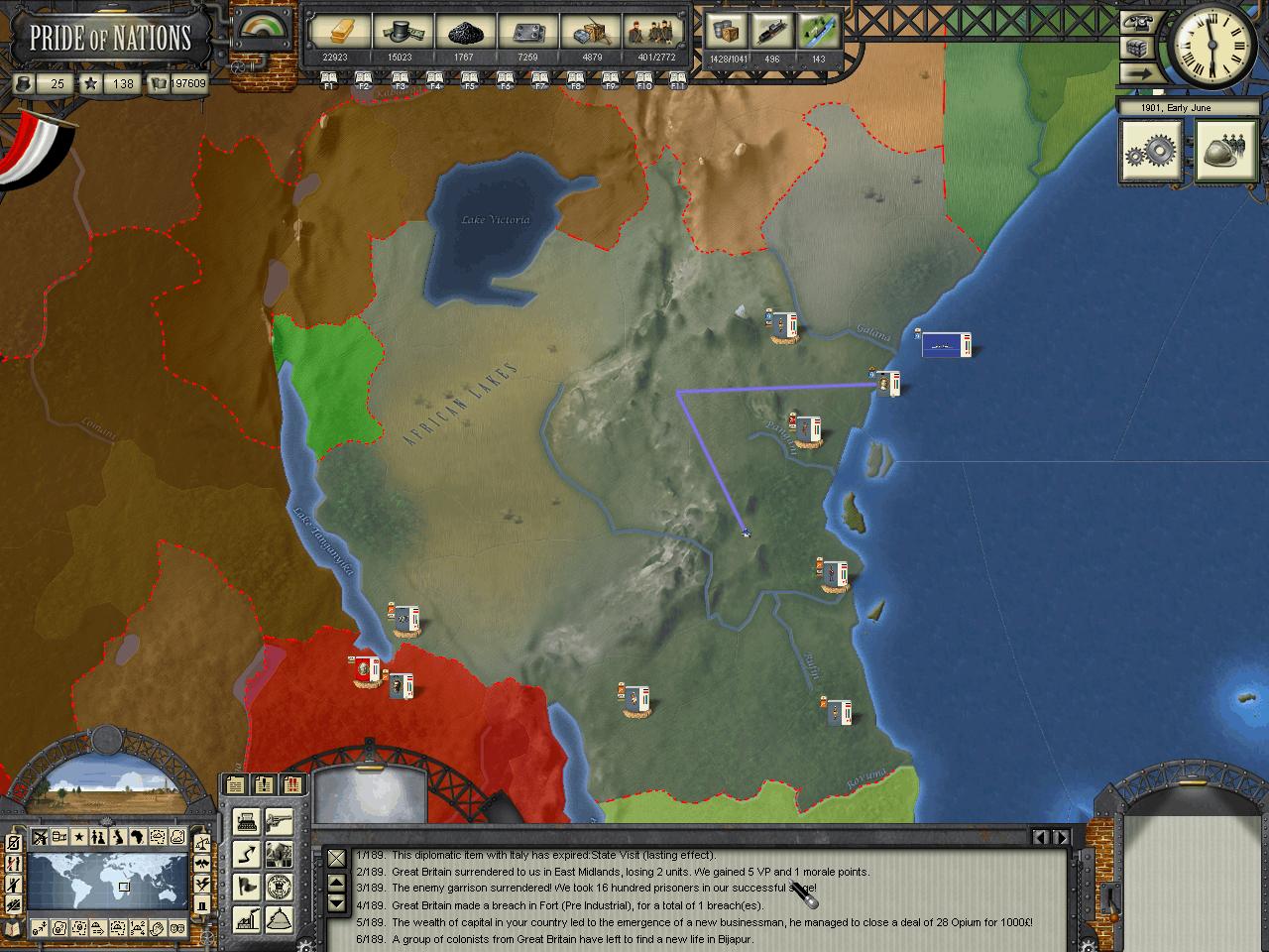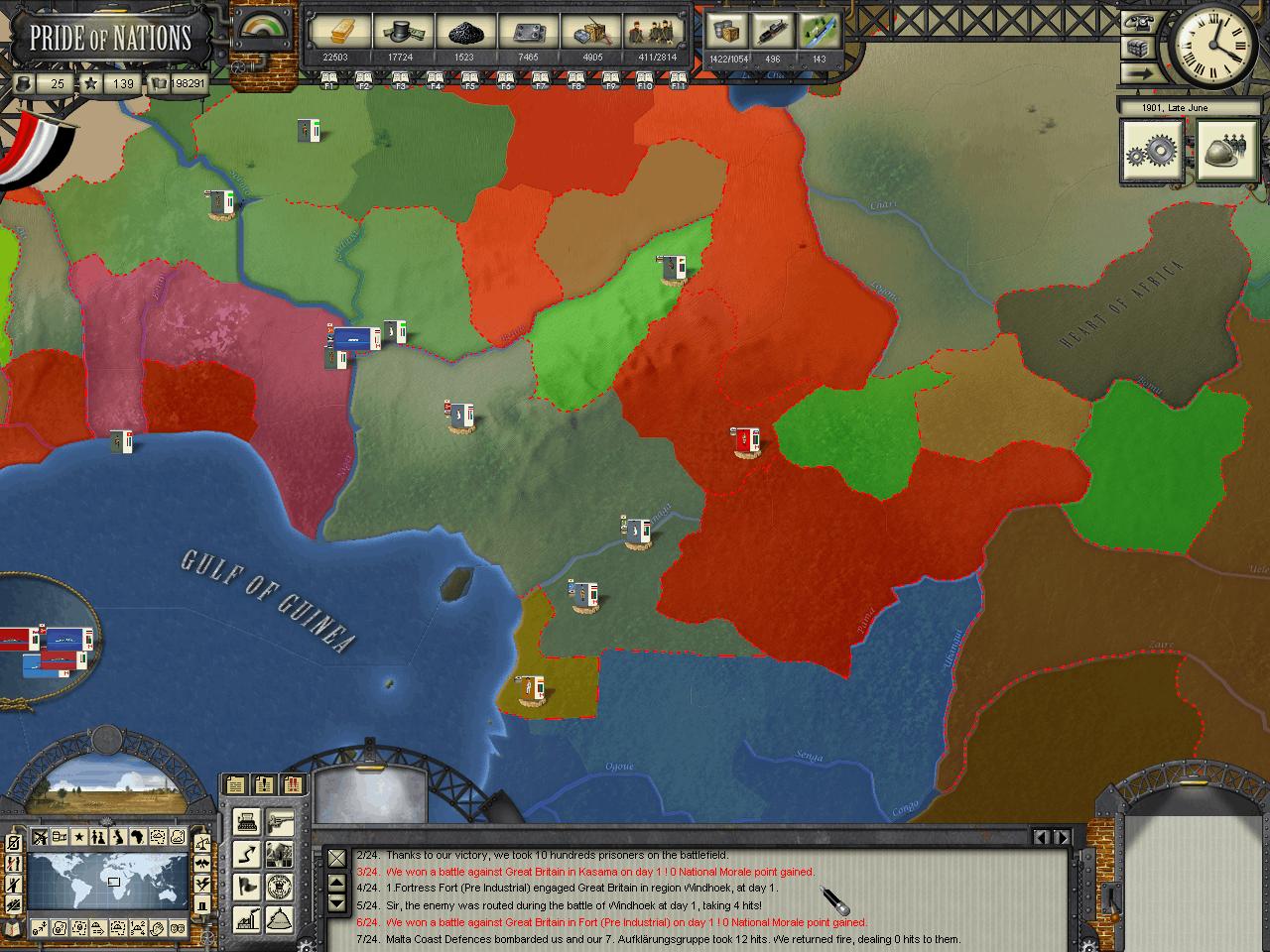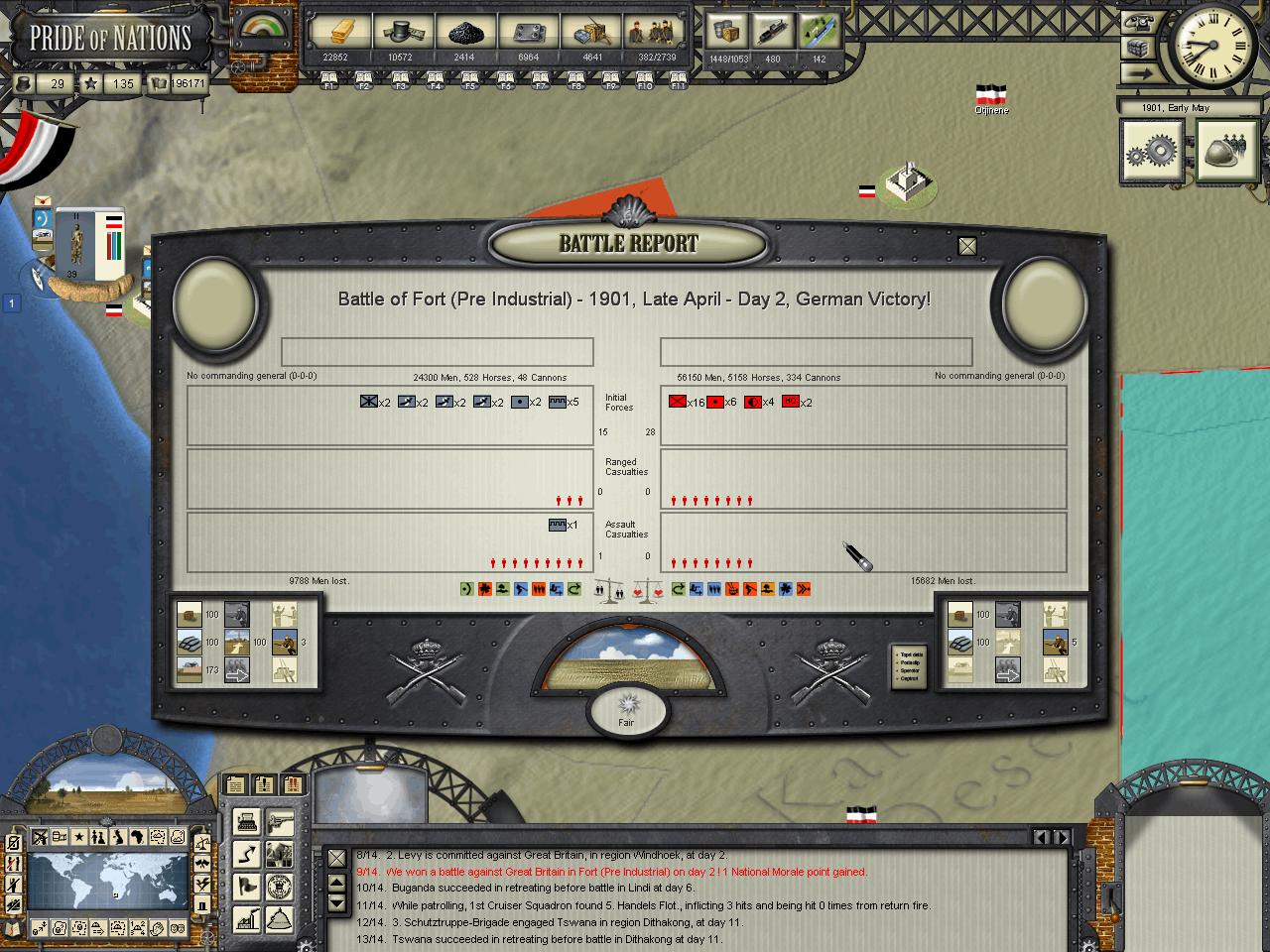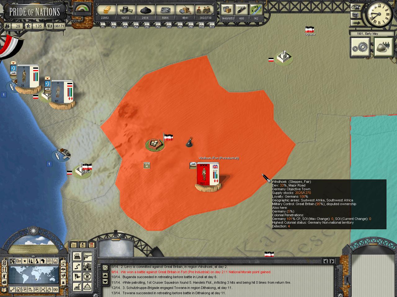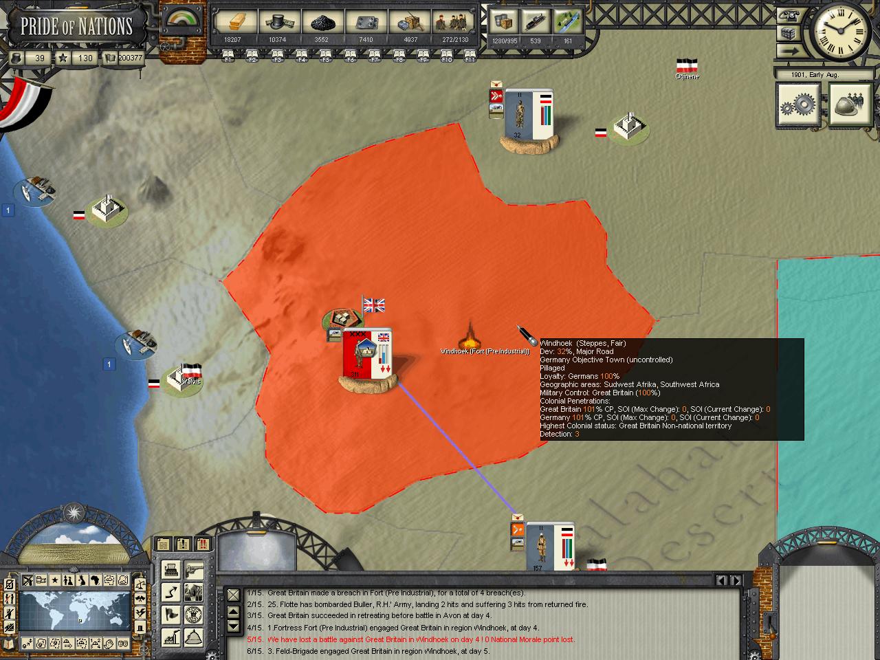 Kensai wrote:HerrDan, could you post some images of the map "zoomed out" (MC filter) so we can have an understanding of who owns what in Africa at the moment? I think your situation is not that critical, but you may need to focus on one-two colonies at a time. The British AI, in my experience, tends to move around troops around theaters in very strange ways. By later stages of the game I tend to find Canadian troops in India, Indian troops in Africa, etc. The AI moves troops around a lot, sometime disregarding the potential inherent penalties some guys can have when they fight out of their locales.