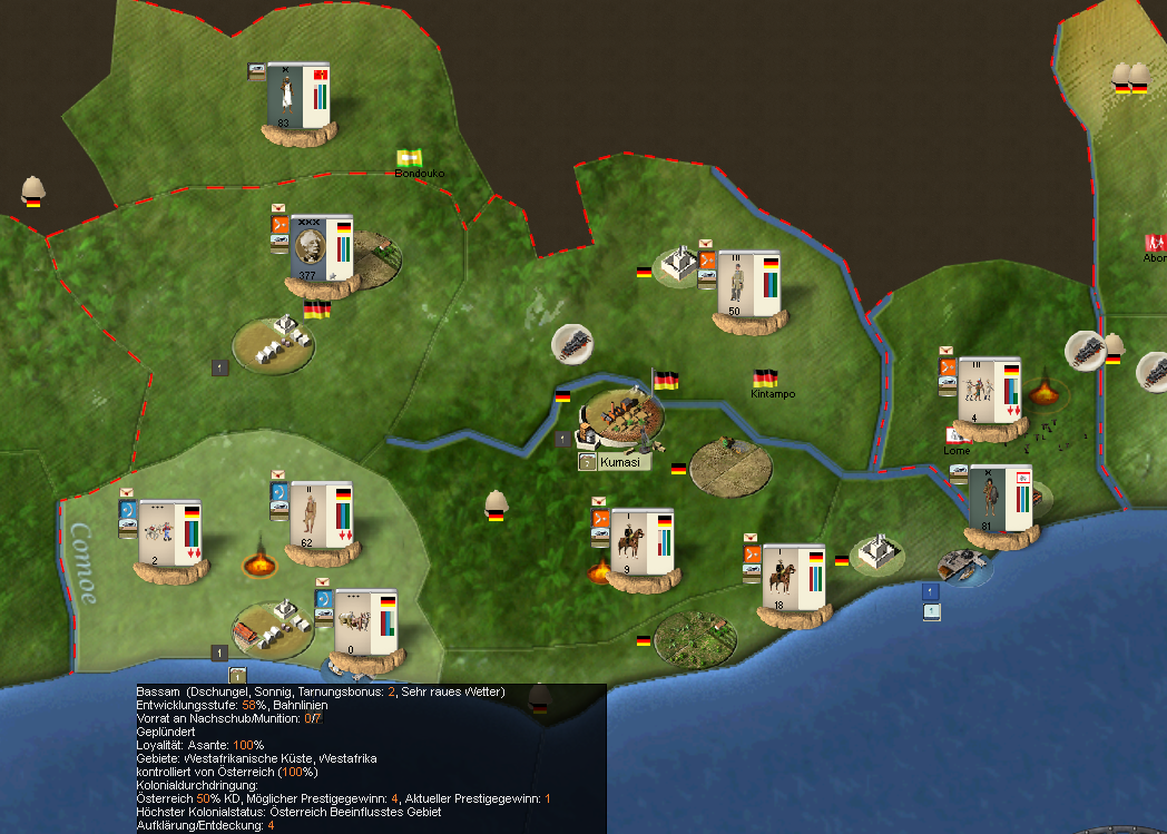 The Ivory Coast is quite under control, but we do not yet have the option to make it a protectorate. Nonetheless works on a gold mine have started, and the railway is being extended into the back country. Zanzibar, as a stepping stone on the way to our new colony on the Arabian peninsular, has been made our protectorate already.