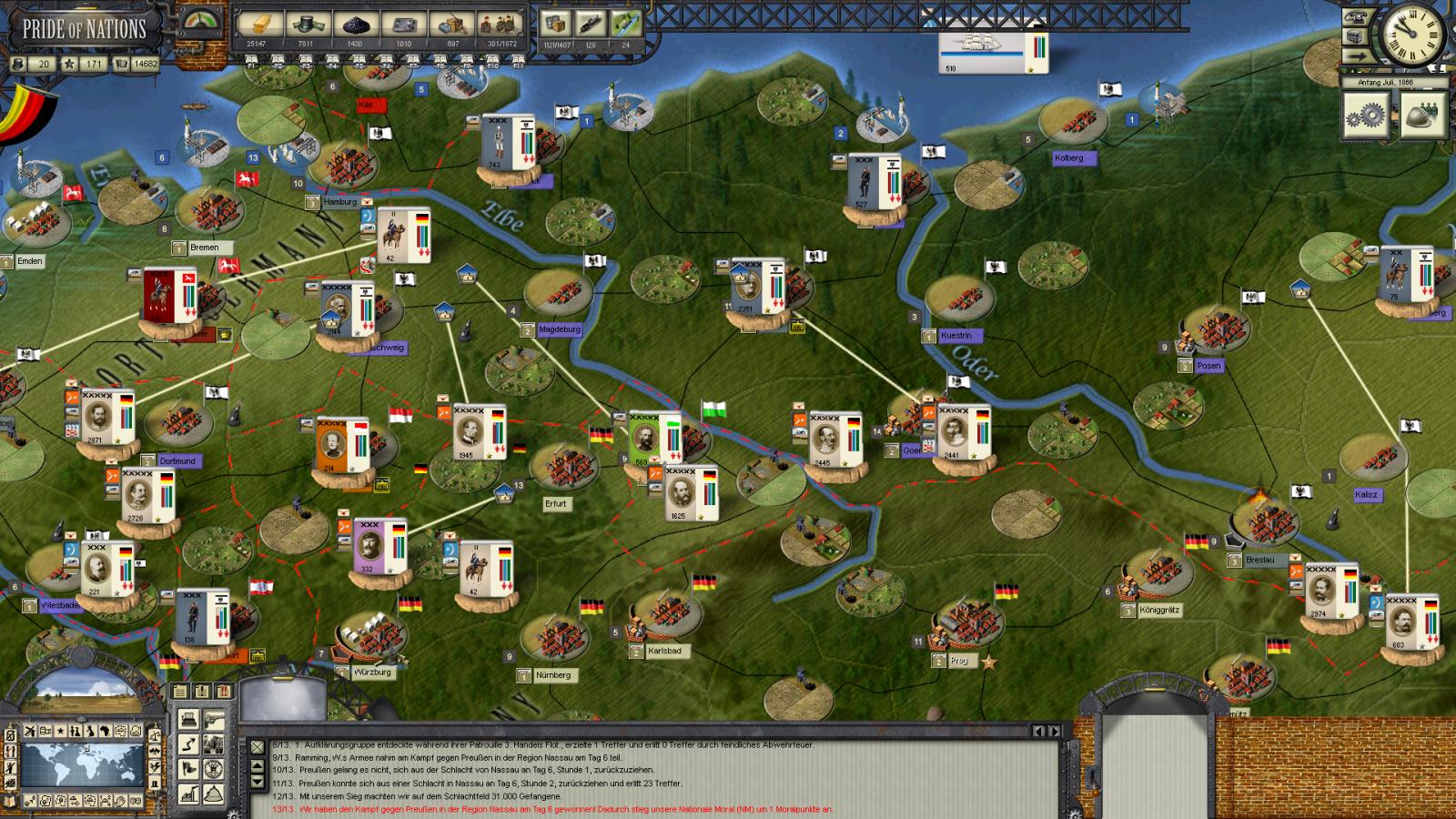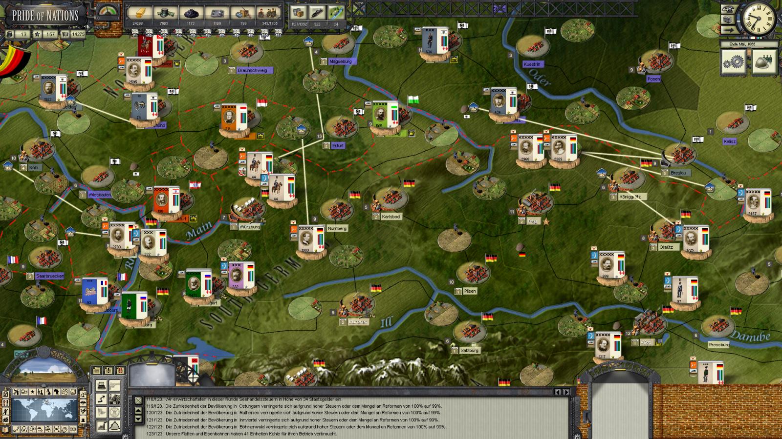In Central Prussia and Saxony, the remainders of the 2 main armies have been mopped up, resulting in nearly a million of prisoners if reports can be believed. In the west, Ramming moves on Saarbrücken where a reserve corps is known to be dilly-dallying - the decision of whether to join the fray will be made for them, very soon. The Baden corps moves south-west as well to clear the Mainz area of some raiding cavalry.