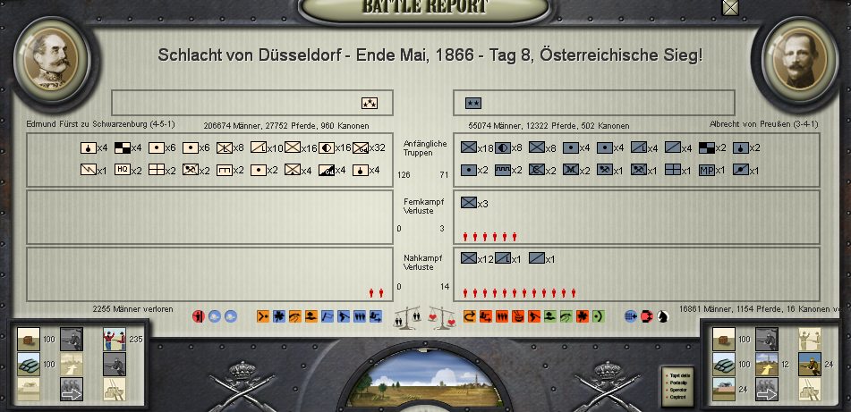 In the east, Prussian troops move about but the Emperor does not wish to advance on them - victory in sight, he sees no gain in slaugthering pressed German peasants and shows mercy and care for those who shall soon be his subjects. Also the siege of Cologne is to be lifted. On all fronts the dust settles and men look forward to years of peace and prosperity under the wise rule of Franz Joseph, father of his peoples.