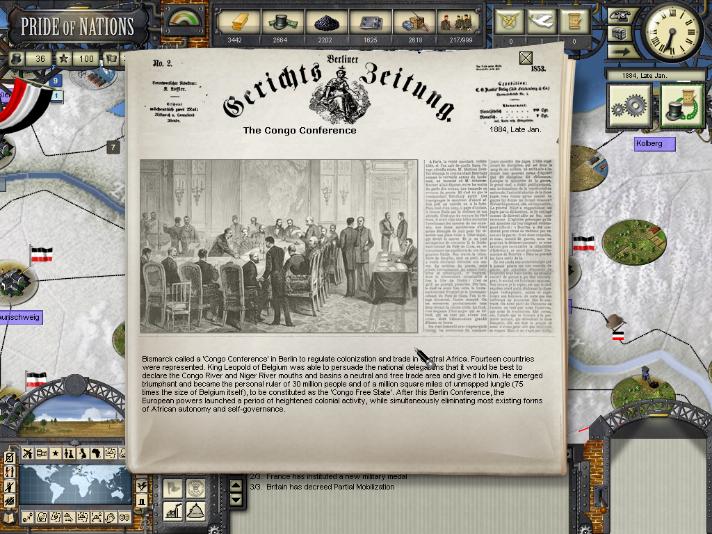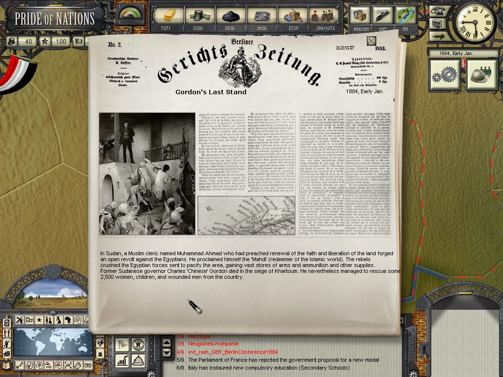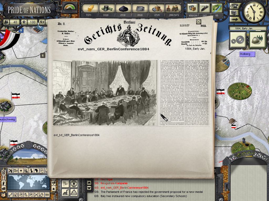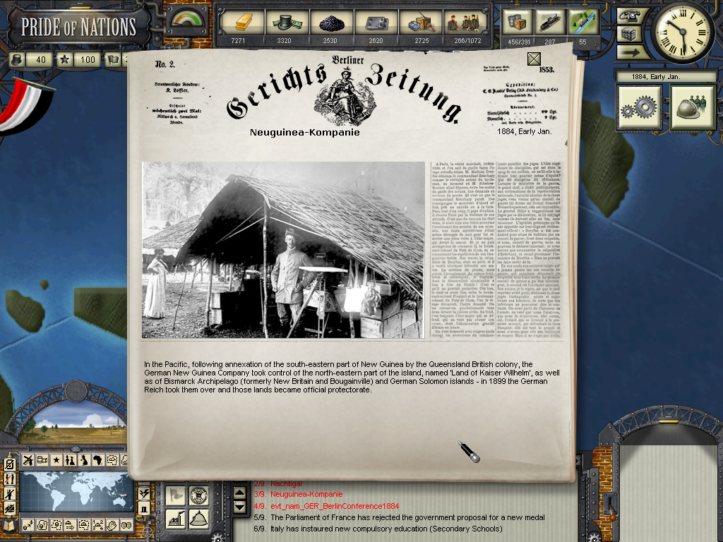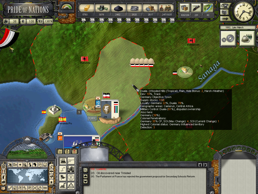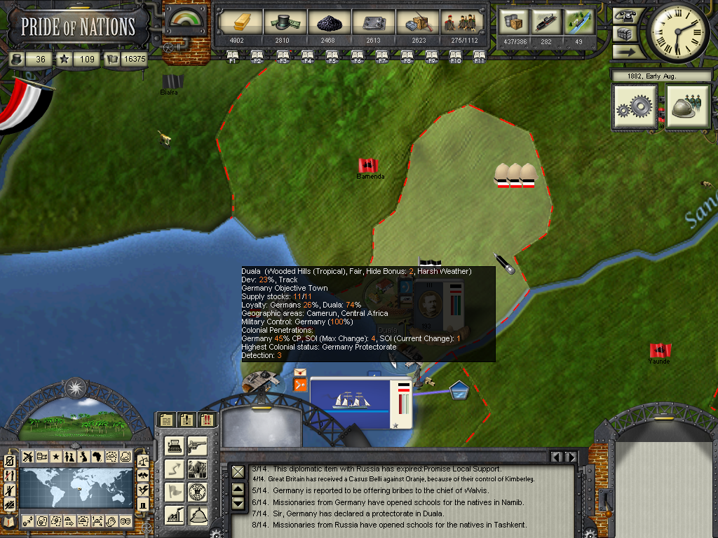 The year of 1881 started with good news: The Three Emperors Alliance Renewal, although I didn't see any alliance appearing on the diplomatic screen (F9). In this game I intend keep the Three Emperors Alliance strong and isolate France in Europe, although it seems as though I'll have to try to do it manually and withing time as the event hadn't created an alliance (I don't know if it's a bug). I have declared war on Dahomey as they refused to give me suply rights and I'll use this opportunity to train my colonial troops commanded by Herman von Wissman, I'll make sure they'll regret this mistake...