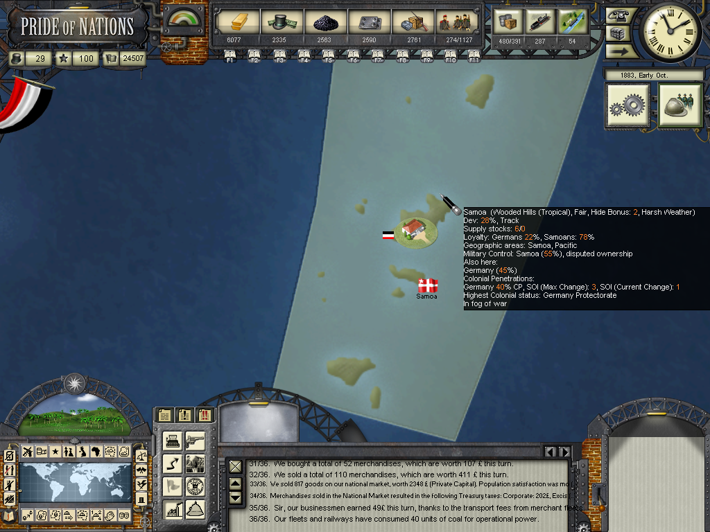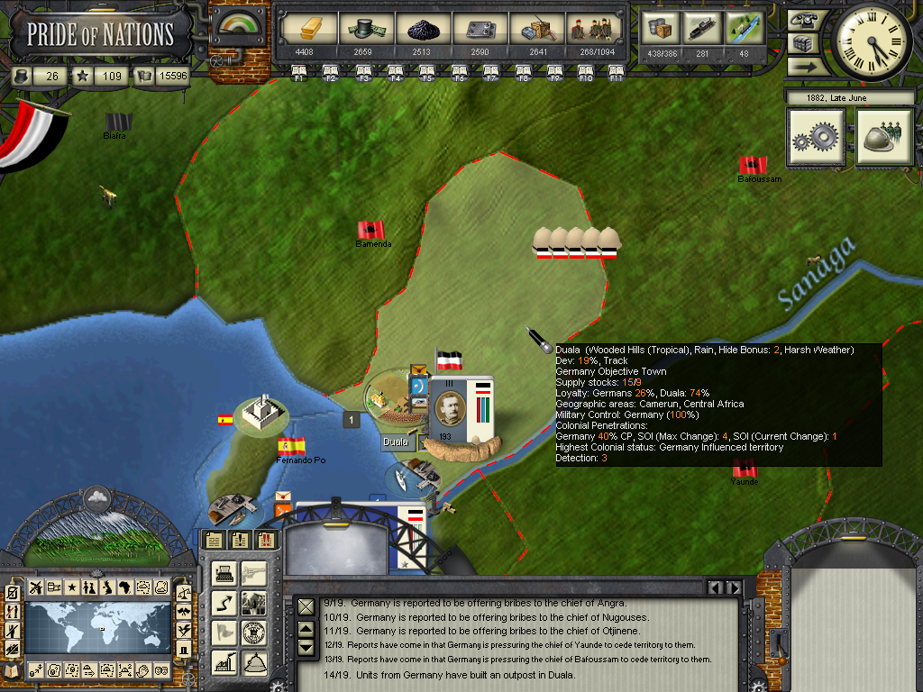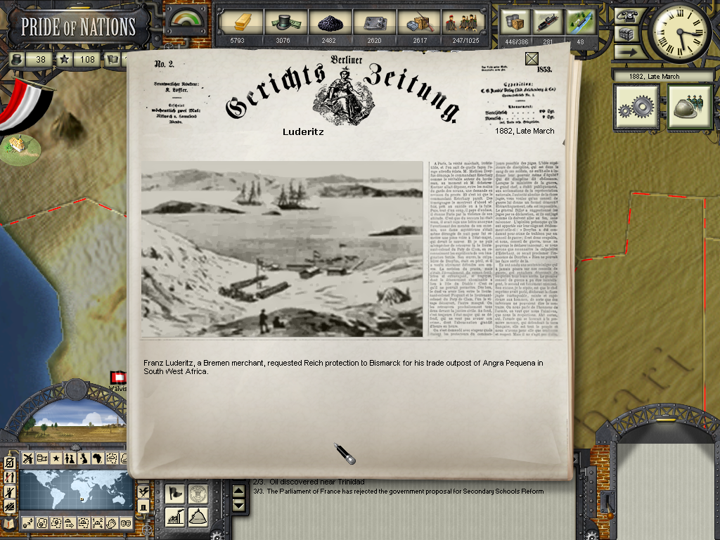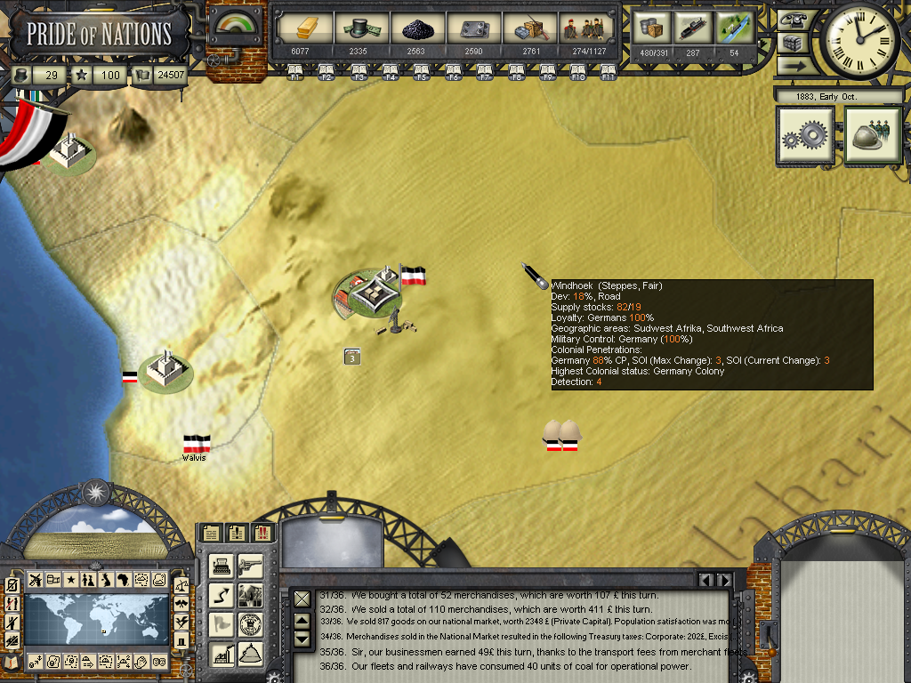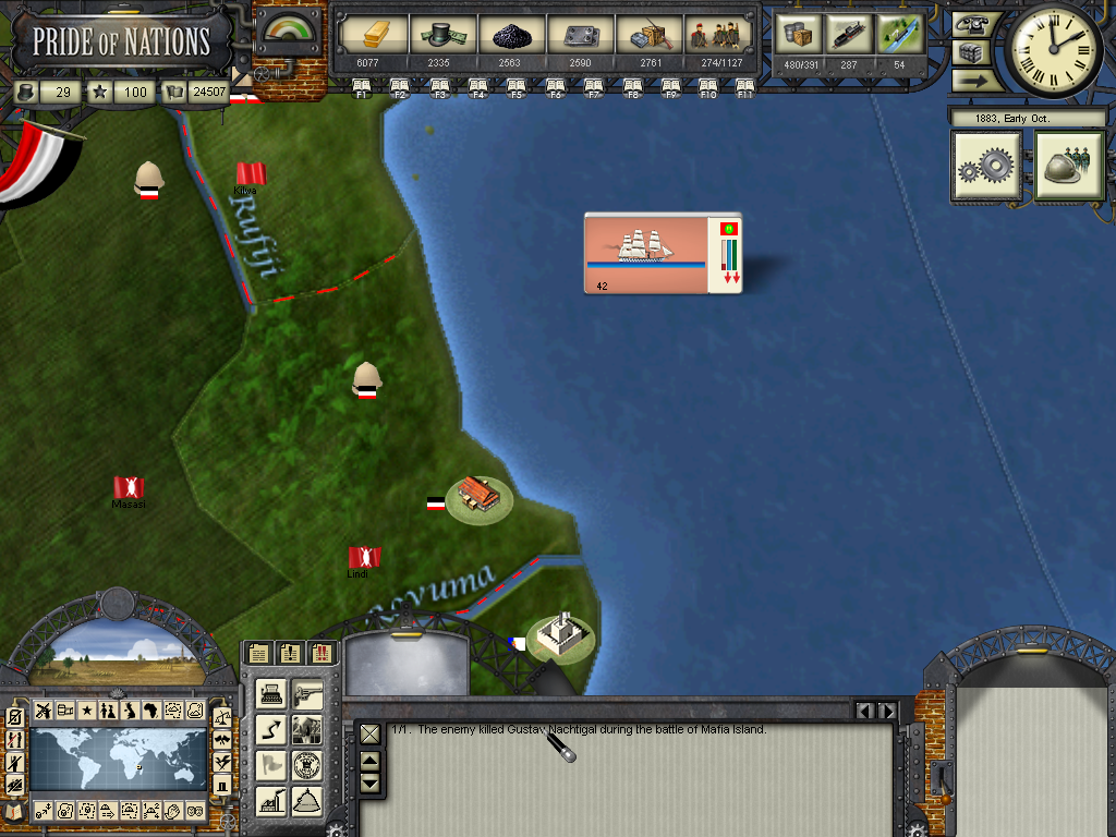 The year of 1881 started with good news: The Three Emperors Alliance Renewal, although I didn't see any alliance appearing on the diplomatic screen (F9). In this game I intend keep the Three Emperors Alliance strong and isolate France in Europe, although it seems as though I'll have to try to do it manually and withing time as the event hadn't created an alliance (I don't know if it's a bug). I have declared war on Dahomey as they refused to give me suply rights and I'll use this opportunity to train my colonial troops commanded by Herman von Wissman, I'll make sure they'll regret this mistake...