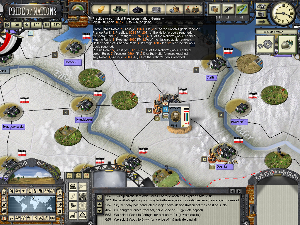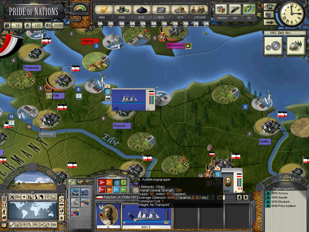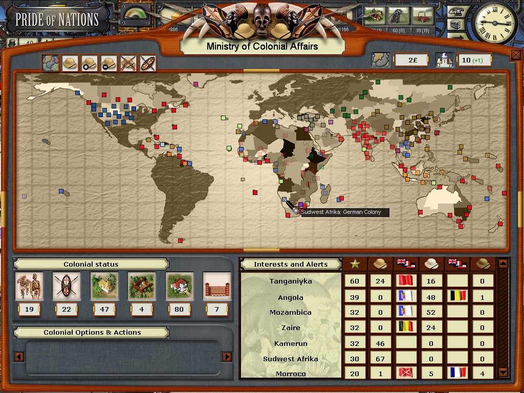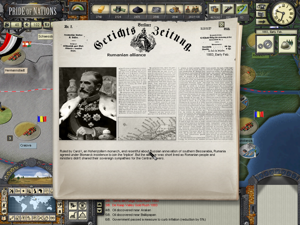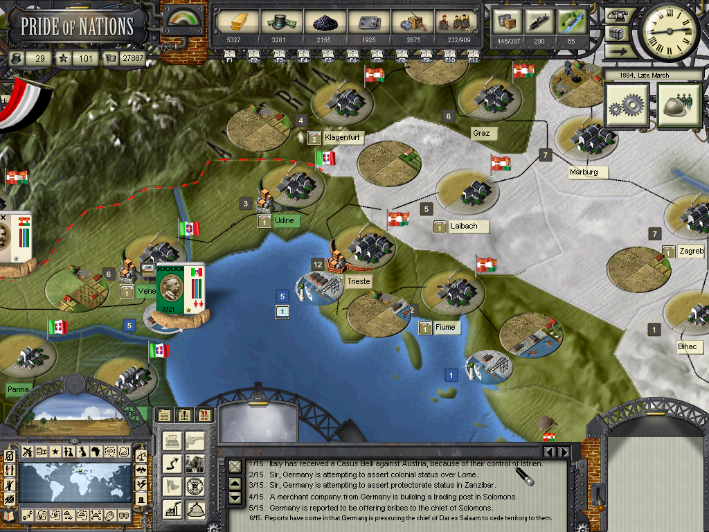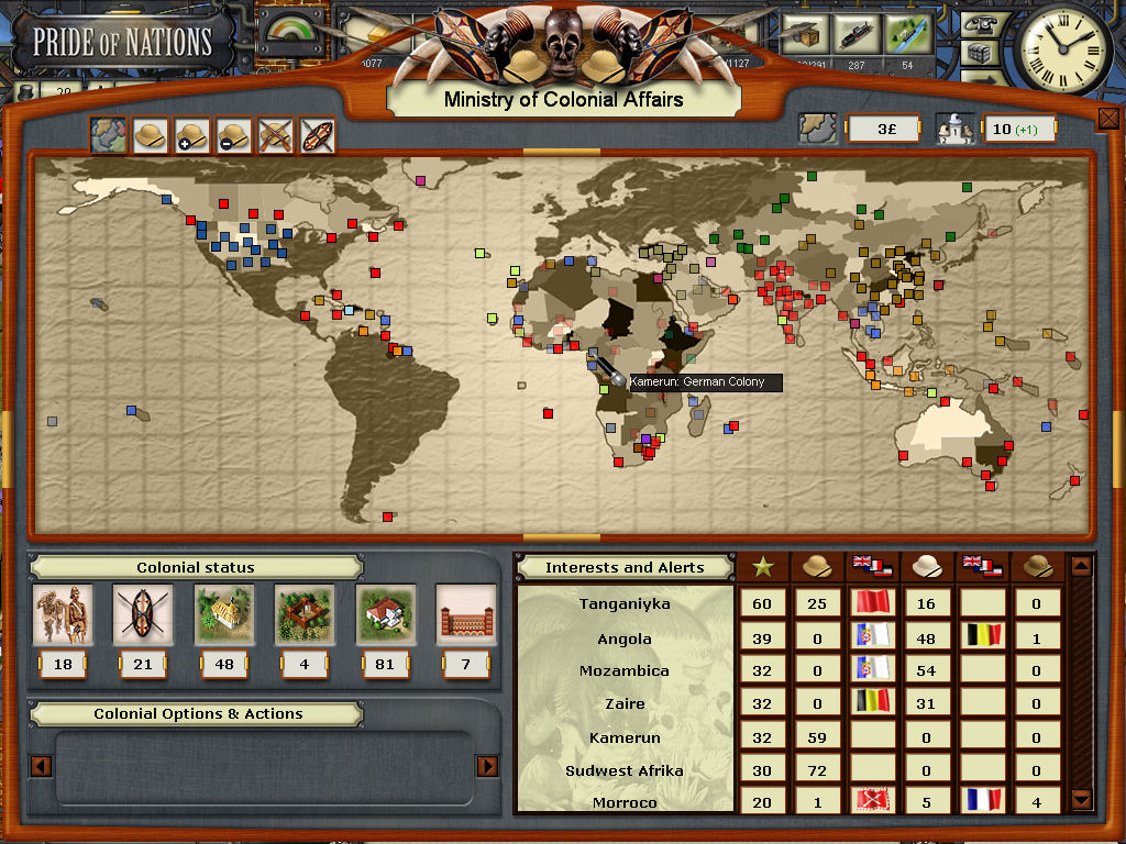 The year of 1881 started with good news: The Three Emperors Alliance Renewal, although I didn't see any alliance appearing on the diplomatic screen (F9). In this game I intend keep the Three Emperors Alliance strong and isolate France in Europe, although it seems as though I'll have to try to do it manually and withing time as the event hadn't created an alliance (I don't know if it's a bug). I have declared war on Dahomey as they refused to give me suply rights and I'll use this opportunity to train my colonial troops commanded by Herman von Wissman, I'll make sure they'll regret this mistake...