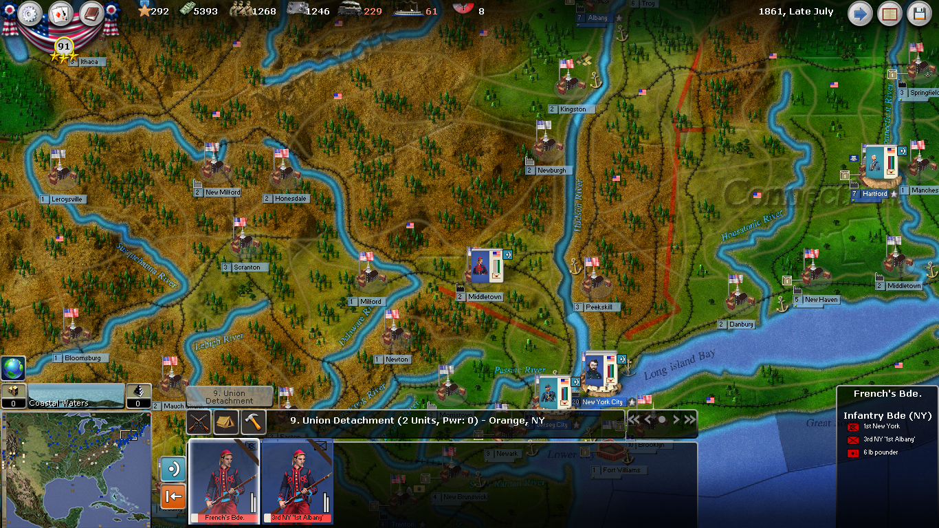 I'm debugging now, has anyone noticed in their game that if you build a zouaves unit or sharpshooter unit as a standalone unit and within a brigade in the same state that they can have the same name? In the screenshot, I've selected "French's Bde.". On the right, you can see "3rd NY '1st Albany'" both as a regiment within the brigade. Also you can see that I've created a standalone zouaves unit and put it into the same stack. This unit also has the name, "3rd NY '1st Albany'". I want to make sure this happens to other people...