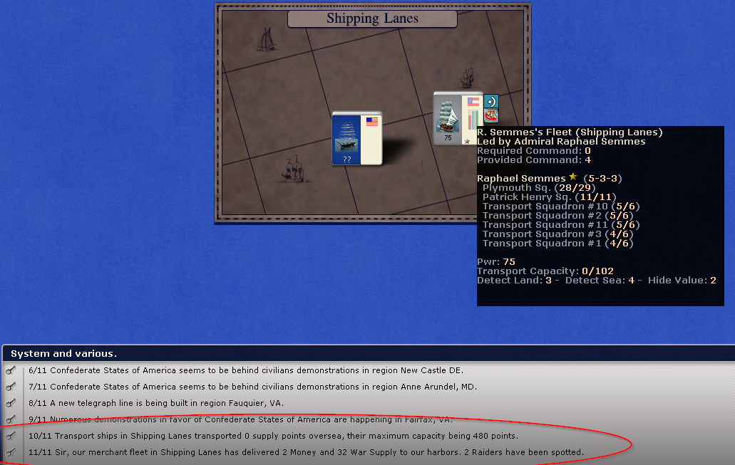 ohms_law wrote:Regardless, right now I'm thinking that transports in the Shipping Box (both Union and Confederate, for that matter) ought to be more vulnerable than they currently seem to be. I don't seem to be having an trouble avoiding Union patrols there. Granted, I've got Semmes' Fleet using the Evade Combat order, but still...