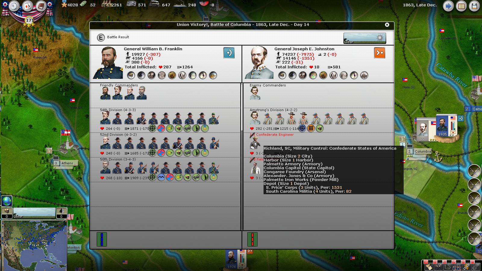 It seems there are two confederate stacks in Columbia : they will not take part into the fight (except if special order given to them) but I think they will be included in the battle report under the total number of troops.