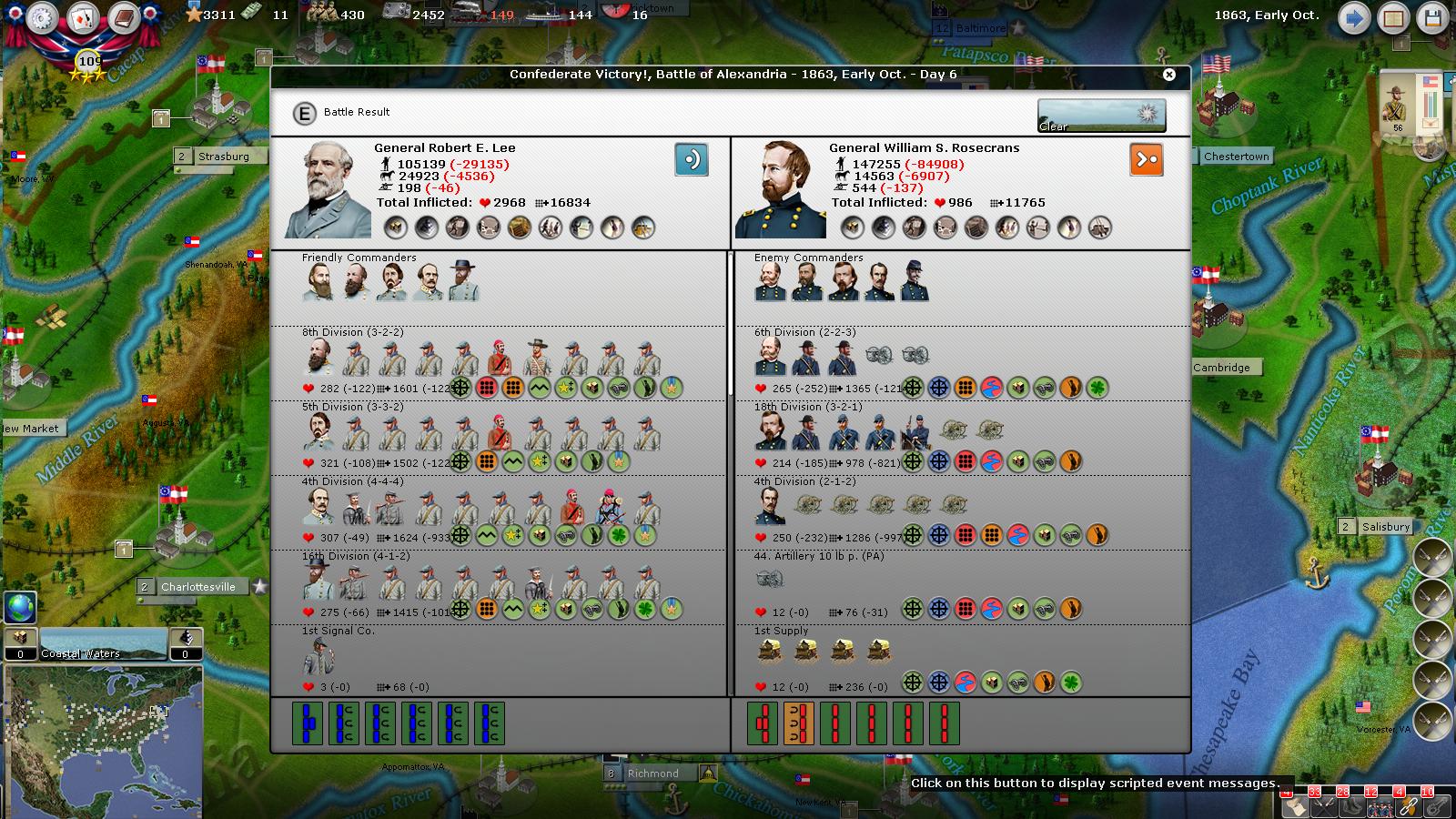Union loosing almost 10 divisions at Washington doorstep, that would be a decisive CSA victory in real life and most PBEMs.