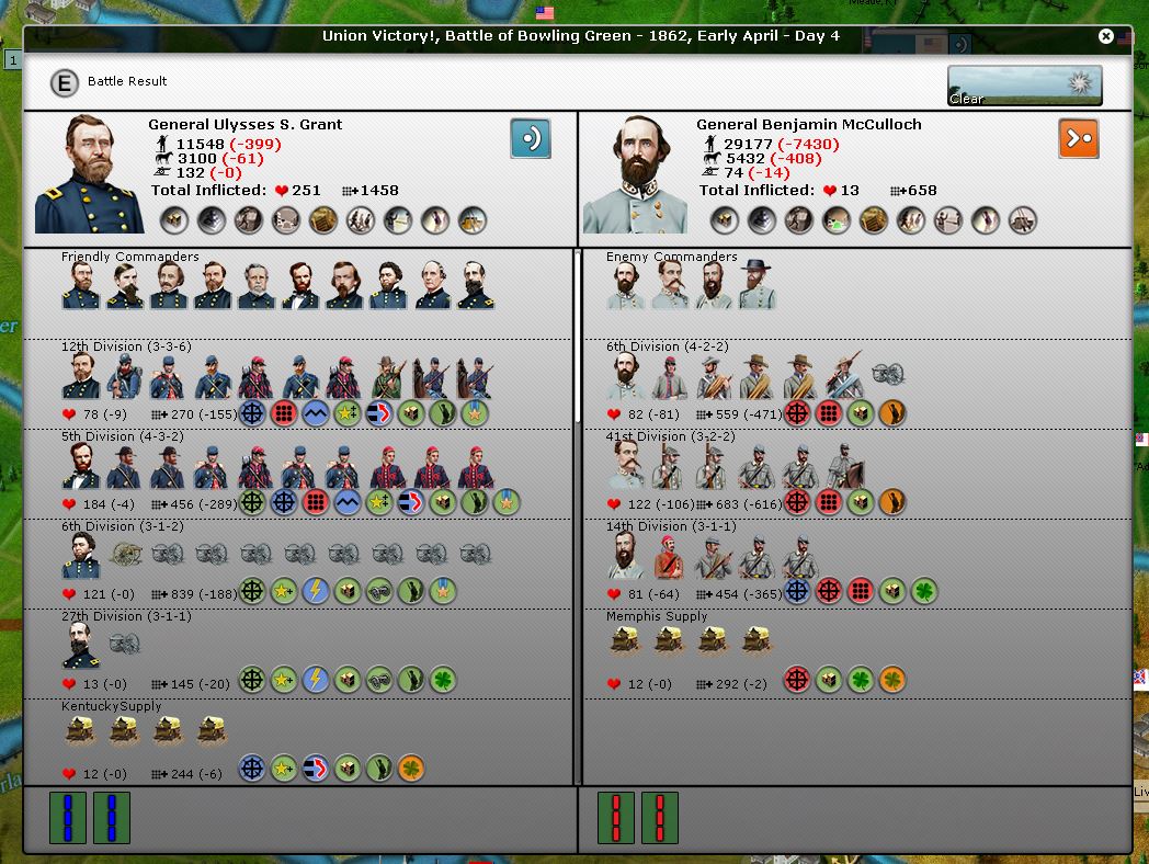In this battle, McCullough attacks with about 15000 men or so. His force is moving into the region with Bowling Green, where Grant sits as well as a force under Confederate General Cheatham, of about 15000 men.