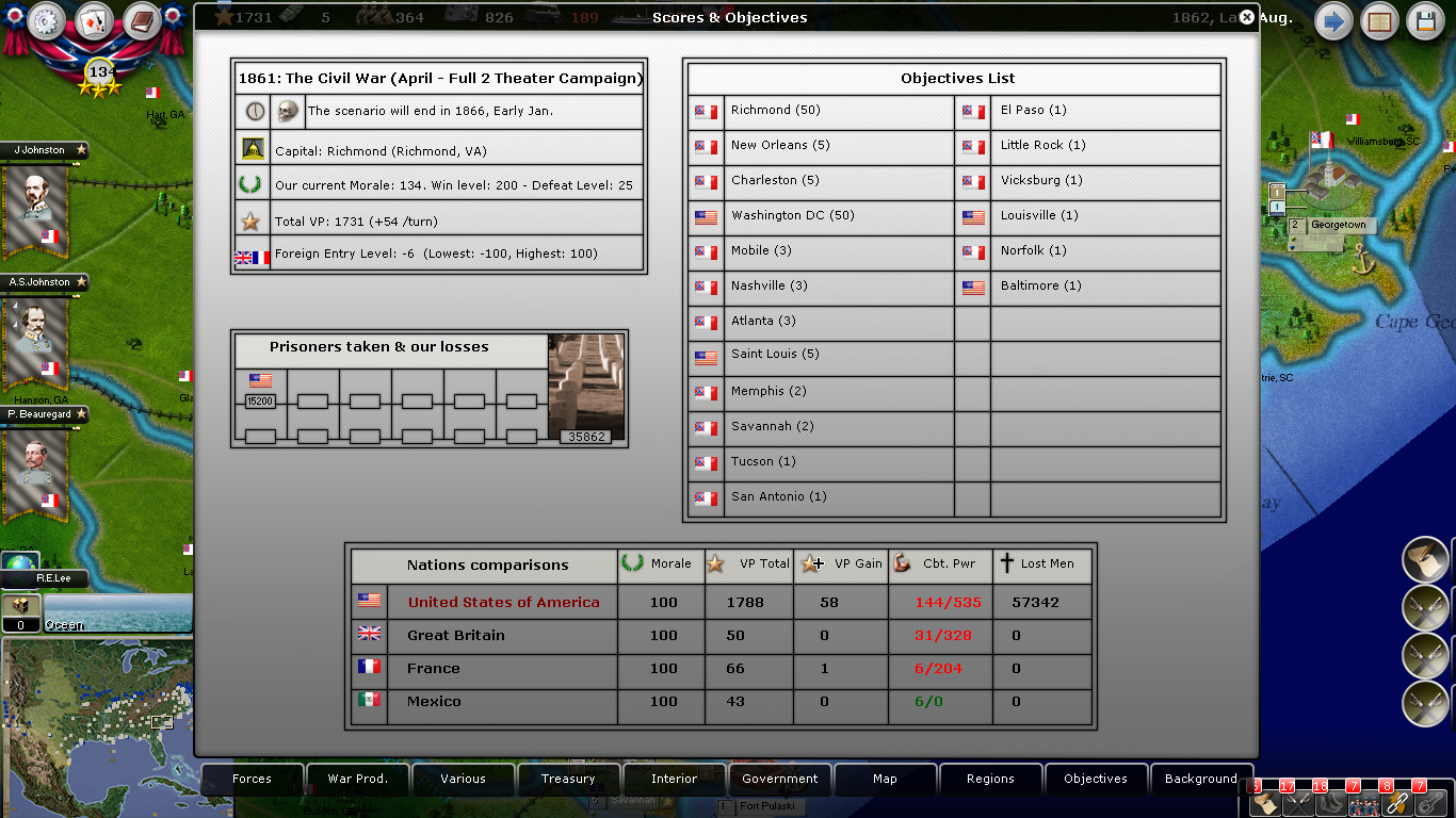 In order to do so I am very active in the Valley early. Athena has a high desire to keep Harpers Ferry and a medium desire to take Winchester, so activity in the Valley draws a response from her. If my forces are large and coordinated enough she has to draw forces from Alexandria to deal with it. I may lose some of these battles, but if so it means Alexandria is weakened enough that Beuaregard can attack, chase away the Yankees in the Alexandria region and lay siege. (This is often a costly battle for both sides). Any Union troops in the Valley are out of position to attempt to lift the siege immediately, and she will be hesitant or unable to use forces in DC. With a turn or two of rest, entrenchment, Military Control and B/R orders, Beauregard's army cannot be dislodged (and the inevitable attempts to do so end very badly for the Union generating a lot of NM and promotions for me). I then either wait until Alexandria surrenders or Assault it after I get a few breaches if I think I think that will earn more NM and promotions. In a few turns the Valley Army should be able to get back any lost territory and possibly even take HF as Athena withdraws troops to defend the now-threatened capital.
