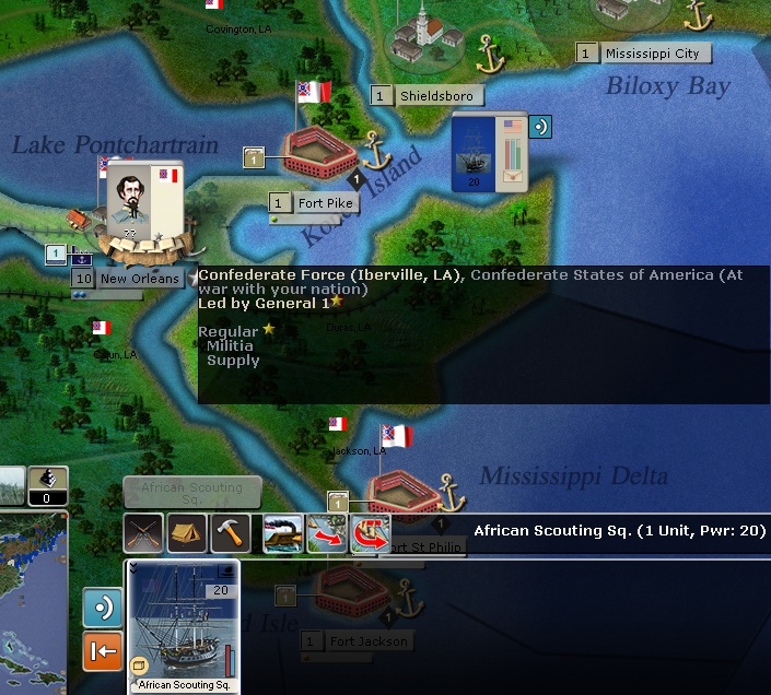 Slick Wilhelm wrote:I'm hesitant in trying to capture N.O. with Fremont's force right now until it's been reinforced, due to the size of the forces that I can see in N.O. right now. The defenders seem to be equal to my strength, if not a little more powerful. But if I can use Farragut's fleet to help bombard the defenders, then I'm going to give it a go.