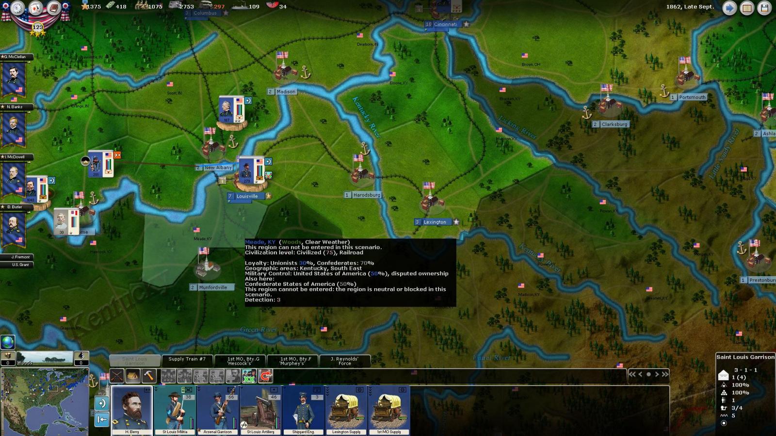 Ace wrote:Kentucky entering is now modeled different than in ACW1. In acw1 it would join Union by event in Nov 61. Now, in September it opens few regions around Louisville and Lexington to Union via Camp Dick Robinson event. For the rest of the Kentucky to open up, it must be invaded via diplomatic option, as was the case in history. The cost of invading is high in 61, and less high in 62. So now you have more open ended game. You have a choice do you respect state neutrality or do you not![]()