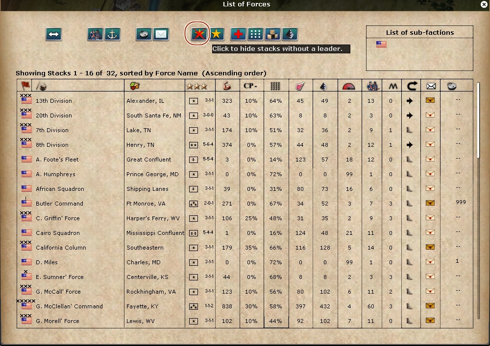 Gray Ghost wrote:I am struggling with the new forces screen. Is this the replacement for the 'roster' in ACW? If so, how do I find a specific general or unit. The buttons at the top seem to be counter intuitive. It seems that one must hide everything he doesn't want to see. What am I missing?