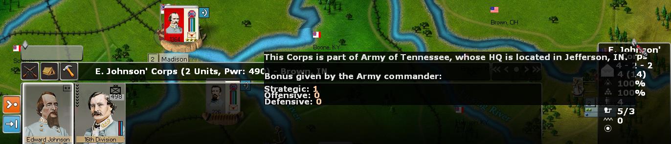 If you are defending with an Army stack it is important to have as many Divisions in it as possible so that it can hold its own until MTSGs arrive on the later rounds. I had good results with 3 Div under ASJ against a 4 Div 3000 PWR stack under Grant, but less so when the third division was with the Corps instead and had to MTSG.