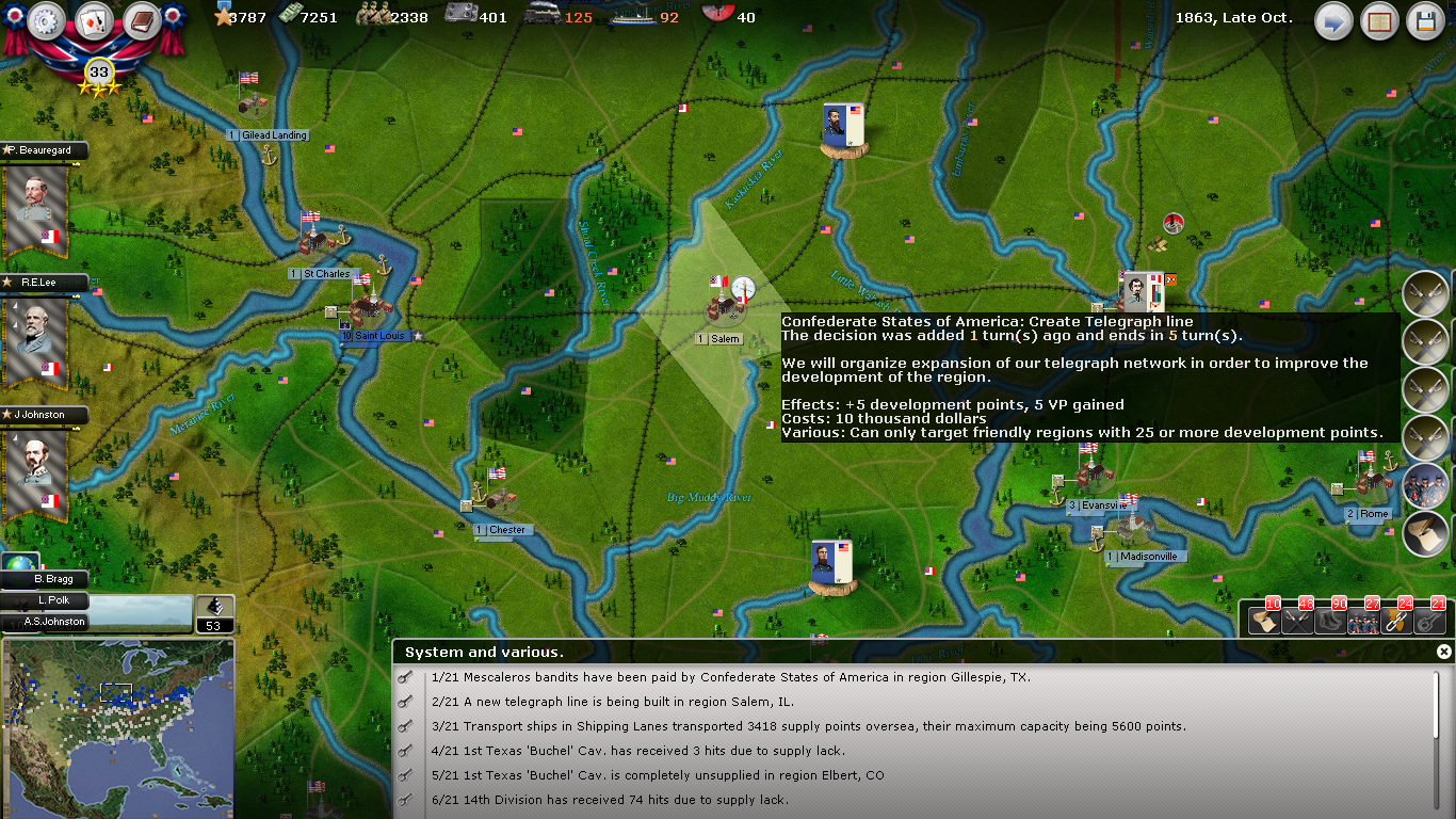 I'm always curious if Athena knows something I don't and I feel like it might be useful to note a couple oddities of my latest game (just won as Union, Confederates sent large force to take Norfolk so I blitzed Richmond/Suffolk and held off Lee in Suffolk while besieging Richmond for 3 months until they gave up the city and the war). Anyway, checking Athena after the last turn, I have two notes. First, why might Athena be building a telegraph in Salem, IL. I have Kentucky and most of Tennessee with Grant next to Memphis.