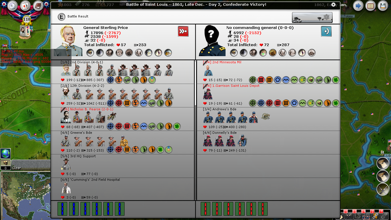 You can see I won the battle and destroyed the 2nd Minnesota Militia and a Garrison Unit. You can also see Pearce was killed (or injured, from the messages I know he was killed). You can see a regiment in Price's division and in Greene's brigade destroyed a unit. From the message bar I can see Price was congratulated. I wrote a program (perl script) that went through the battle log and re-did the summary:
