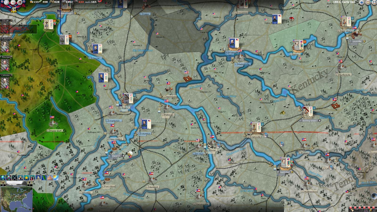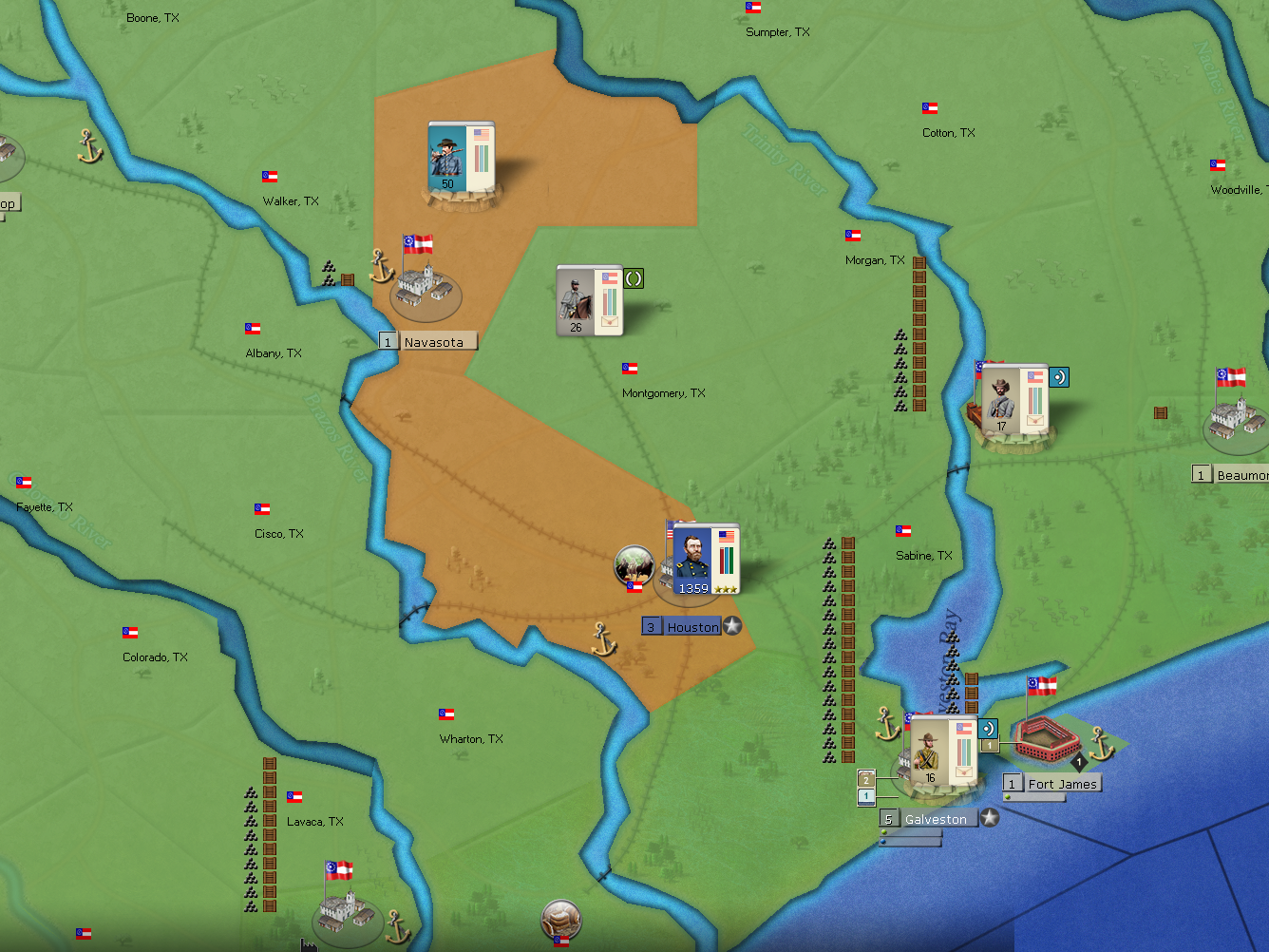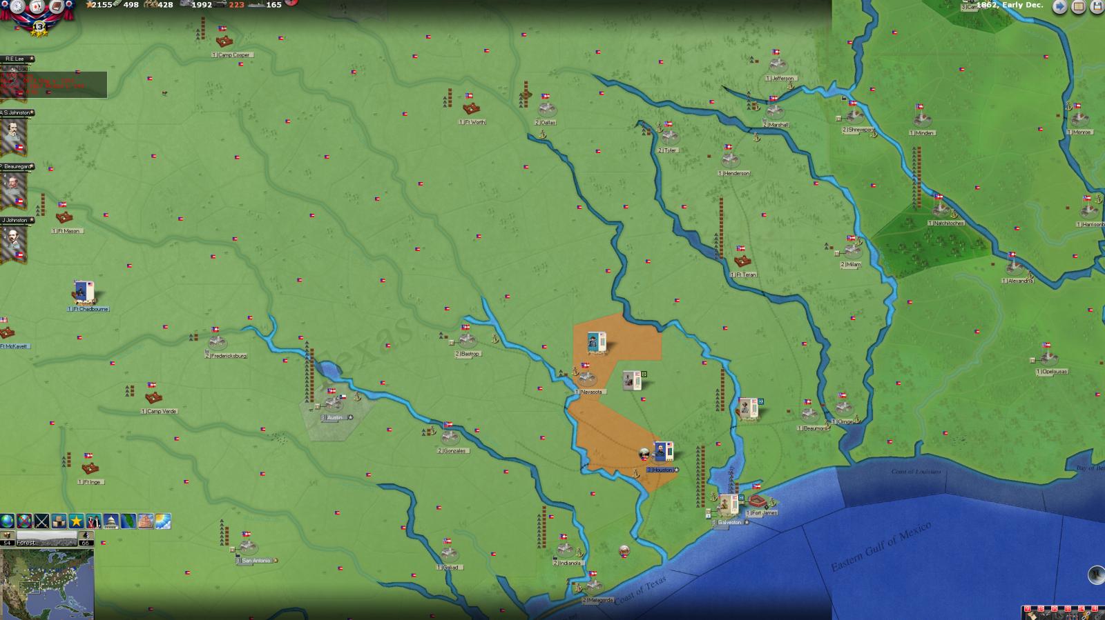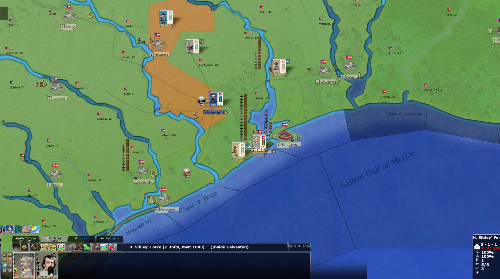 Hickman Kentucky to Houston Texas is roughly 698-777 miles apart- not that great a distance in todays world of superhighways, but back in 1862? That's an animal of an entirely different color- and to have a leader traverse that distance within 15 days while plausible it was not done within game parameters- e.g. rail, road/track/undeveloped tracts, river or seaborne or combinations of all or some of the available transport conduits, and given the nature of the terrain and locales involved and weather renders this nigh onto impossible. And to have a Corps accompany this leader over the same distance, within the same time frame is not a minor glitch, it is a major bug. I was able to spot this particular event this time; but how many have I or did I miss? To state that this is an isolated occurence is not valid as there is no empirical evidence, as of yet, to support this as being isolated- the array of units involved is too large to succinctly allow comprehensive tracking. I was fortunate in that the named leader was a significant historical figure of note, so it was easy to spot; but for some other Union leader to have done the same thing I very well could have missed as there would have been no mnemonic trigger involved.