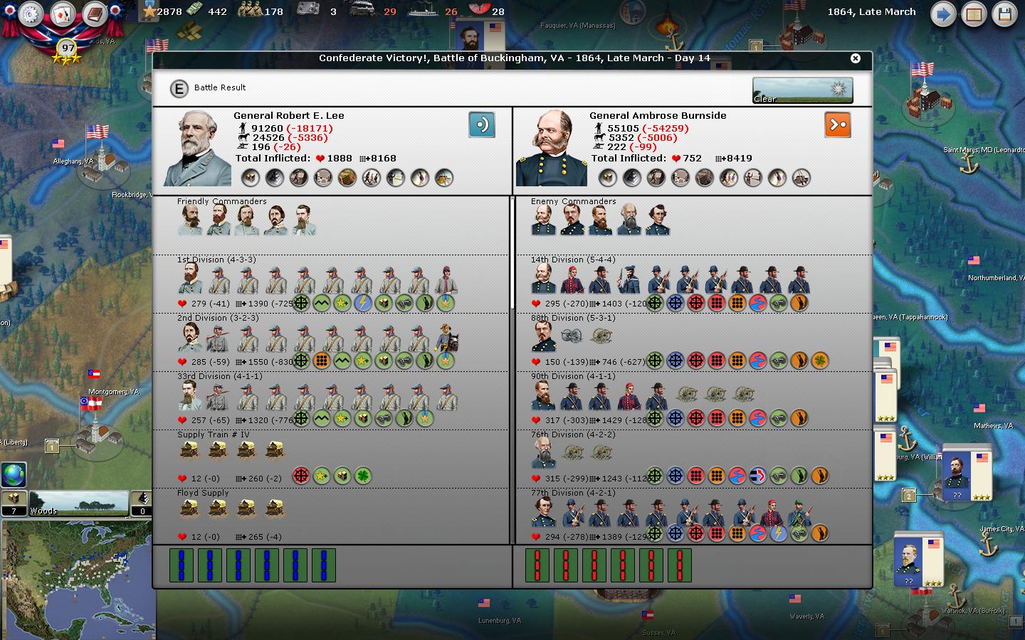 This happened in a game of mine a while back. That's what can happen when a reinforced and entrenched force under Lee deals with an attacking Union force. Paper rock scissors. A few more battles like that and it was game over.
