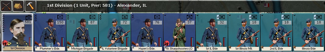 It's basically a starting brigade with infantry and one cav element, two of the starting brigades with a light infantry element and two militia, plus a sharpshooter and the rest volunteers from that state. The pic is from an ongoing game, so some of the elements have upgraded over time to line infantry. This is another benefit of the strategy. Build lots of militia early and give them something productive to do until they grow a pair. ;)