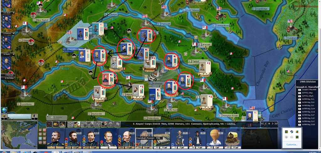 elxaime wrote:I think the timing here was key. The massive assault with Grant on Manassas was launched the turn before Lee was active. Due to the way command works, it took two turns to get the CSA corps of Longstreet and Jackson under Lee's control, since I had to leave Beauregard in command while Lee rushed over so my army wouldn't be leaderless in the middle of combat. Meanwhile, two CSA divisions were decimated. Grant plus eight corps meant the entire front was covered by a blue carpet rushing forward, so defending north of Richmond would have just meant being encircled.