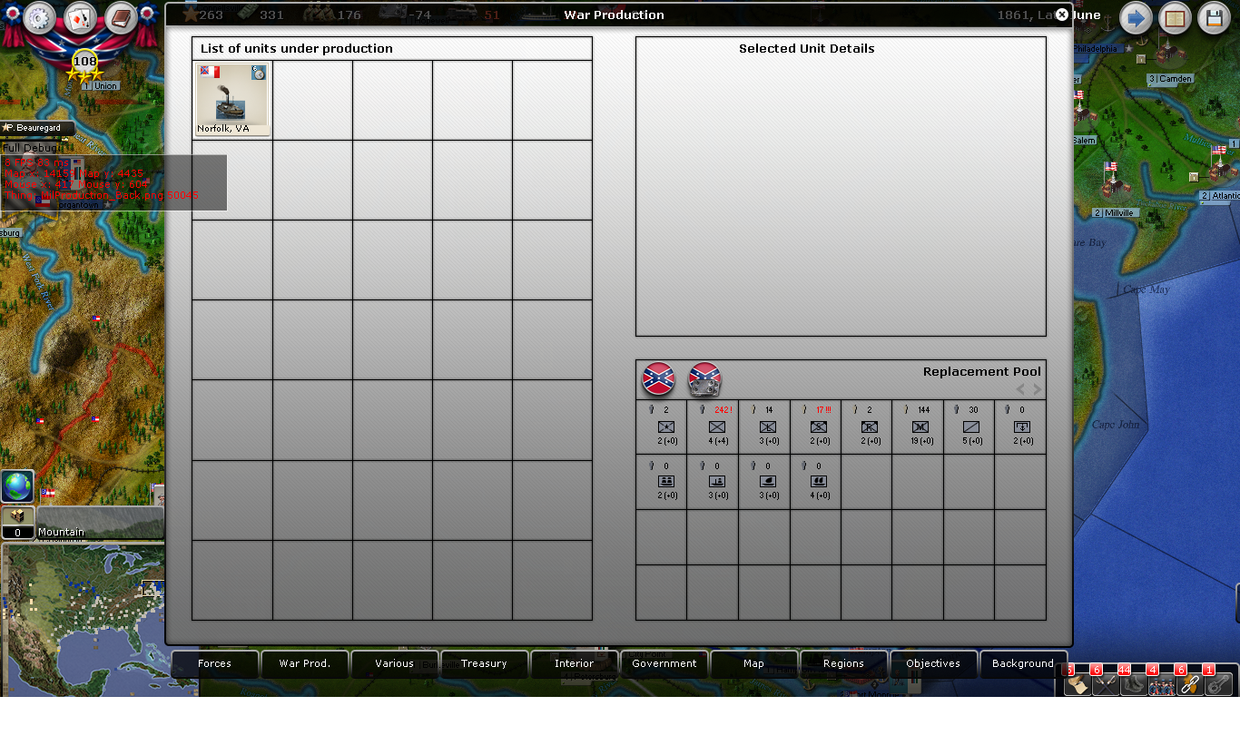 The game starts a bit slower, at least until Early July. Both large armies in the east (and in the West) start with larger brigades with more regiments (but mostly conscripts). However, I start both armies with slightly more red than before so early on there isn't much recruiting to be done, as both armies have to concentrate oh buying replacements. Perhaps I should give the players more free replacements or start the Armies fuller strength.