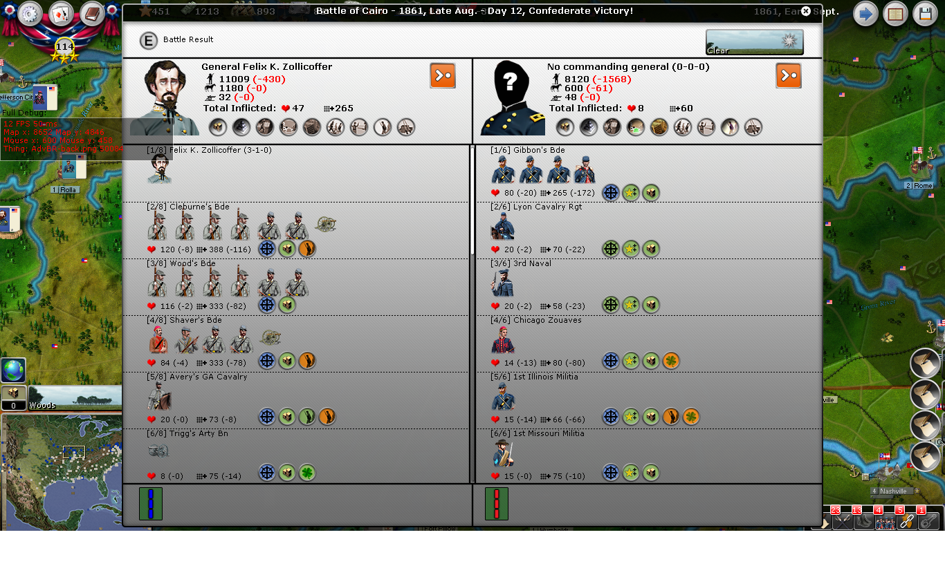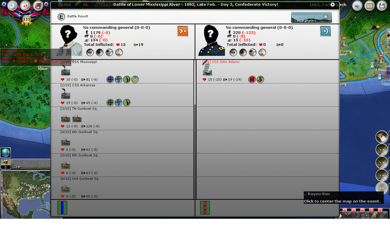 After controlling Charlston last turn, I sent an amphibious Zollicoffer leading a changed Army of Tennessee by water to Cairo. This change is a somewhat big deal, as I've gone with brigades from Shiloh to fill Zollicoffer's ranks, and thus his force is stronger than in the game, but there isn't a close by equivalent strengthened army (except in St. Louis, which the player may tend to send towards Southwestern Missouri). It will take a few tests to see if this is unbalanced or not. For this game, Zollicoffer won some battles, but didn't finish off the garrison, or at least not yet.