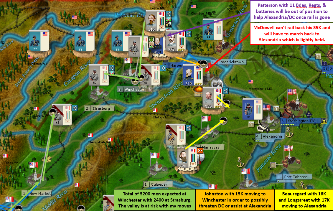 During the reorganization, I’m left with one runt infantry division with only 7 combat units. So I’ve removed Huger from divisional command and will have him with Johnston’s 37.5K army just for his artillery bonus. Floyd is moving up from Alexandria with a couple brigades and batteries in divisional formation to flesh out the weak artillery division and give me that 4th infantry division for that army. I’m also bringing another couple brigades and a battery up from DC and Annapolis to fully bring Beauregard’s army up to snuff. And I’ll need that army at full strength.