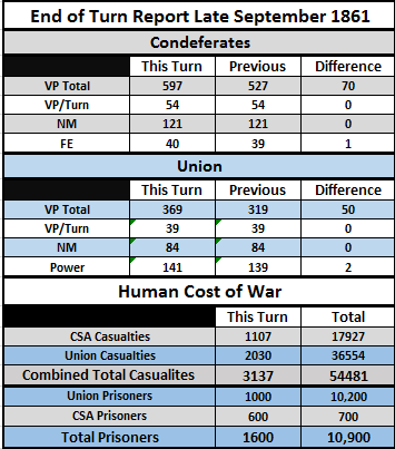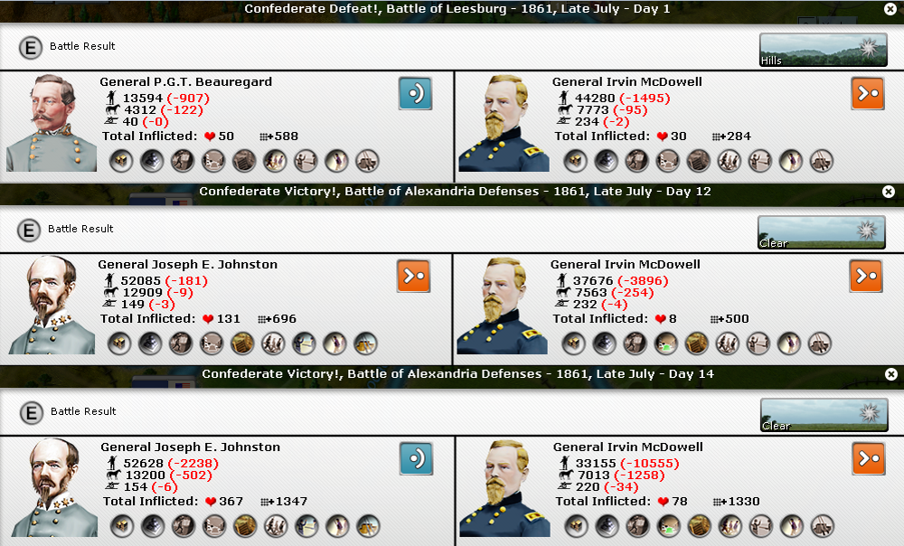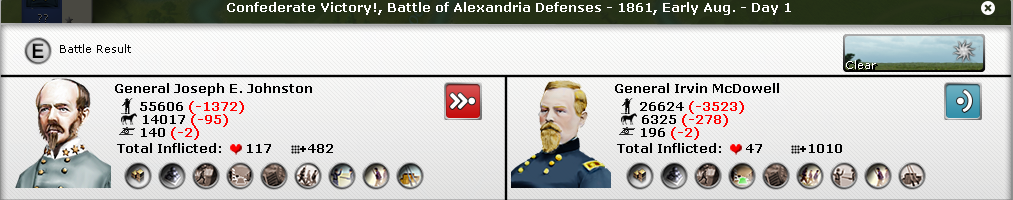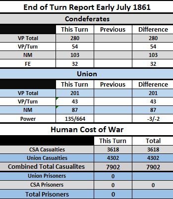 [color="#808080"]OVERVIEW:[/color] Clear weather in DC! Johnston prepares to lead the Army of the Shenandoah against Washington DC. Confederate forces lose battles in Bowling Green, KY and Erie, MO but win a key battle at Manassas. Demonstrations fail to take in Boston and are countered in NYC, both will be re attempted.