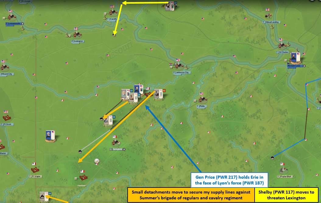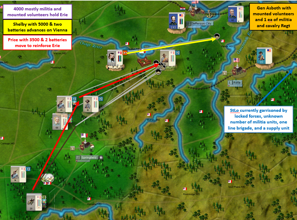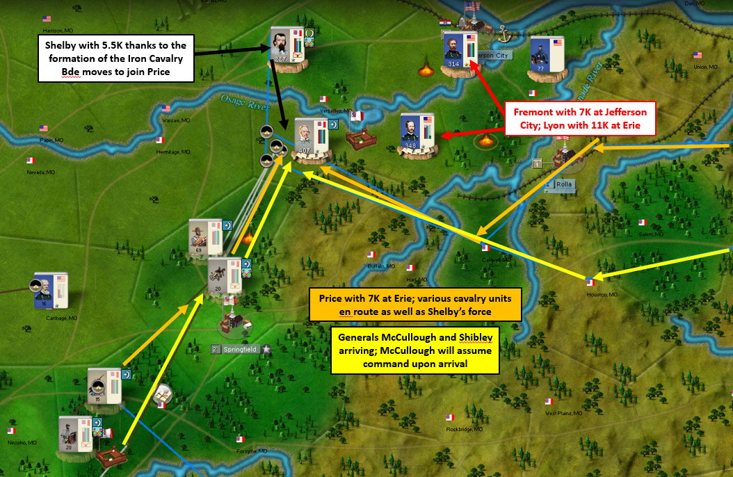 Fremont’s force added its numbers in the attack against Erie and Price continues to hold my forward position despite facing 2-1 odds in that battle. I killed a volunteer regiment and lost a cavalry regiment in the battle, but I inflicted more damage than I took even though it goes up as another Union win. With Shelby’s return, I have a better hold of the region and I expect Fremont and Lyon to retire back to Jefferson City to regroup. This is all good news, but Price has moved up in seniority thanks to the battle and now McCullough would be under Price’s command instead of the other way around. So McCullough will head south to meet a couple cavalry regiments in Springfield where he can form a division without worrying about the temporary stat loss, then he’ll move back north and will take over Price’s division and Price will move back to Springfield. Something I’d like to try if I get a breather is taking a cavalry division under Shelby to StLo which is pretty wide open thanks to Fremont’s presence in Erie. I will take the shot if I see the opening next turn.