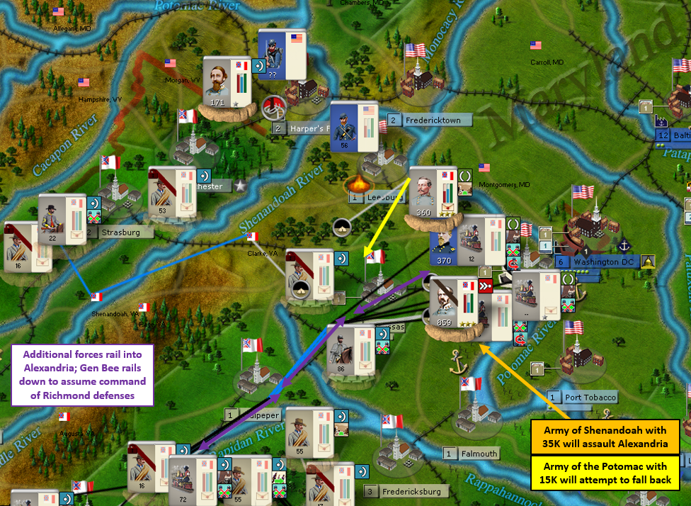 My hope also is that Annapolis will hold off any Union reinforcements from arriving to assist DC against my 1-2 punch. At the very least, that force should delay any relief effort. I’m also leaving the rail network wrecked as a further hindrance should Union forces push me out. I had considered sending Winder’s weak division up to Montgomery last turn as I knew I wouldn’t have 8 full infantry divisions. But I thought I’d need something in Manassas to counter any Union forces in the valley moving east and threatening my supply line for my armies in Maryland. I just didn’t think I’d need that division that very turn. But tripax surprised me and was able to reach Manassas this past turn with a division. Luckily though, Winder’s weak division plus a couple brigades from Richmond and Alexandria gave me enough to hold my supply lines. Good thing too as things could have gotten pretty interesting if my armies didn’t have a source of supply.