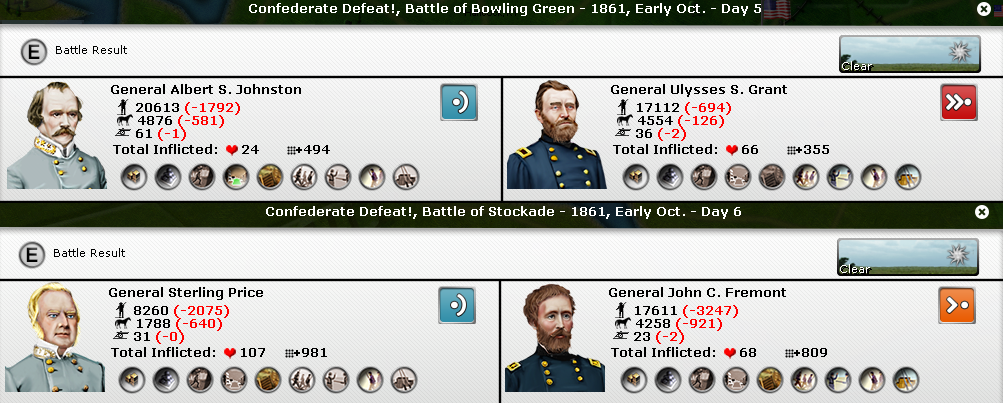 [color="#808080"]WEST:[/color] Tripax moved against Bowling Green instead of Clarksville like I thought he might. And Grant’s force caught my reinforcing units and destroyed my small infantry brigade as well as 2 batteries. My army showed up in the battle, but it was too late to rescue any of the arriving forces. I do however have a brand new large Kentucky brigade that is now ready for action, so my force has grown some despite that loss. I’m more upset though about losing those two batteries then the small brigade. My estimation of tripax’s strength was pretty much on the money and that gives me numbers (at least for now), but I have too many militia and volunteers in my force to feel really confident. But fighting defensively should help me retain control of BG.
