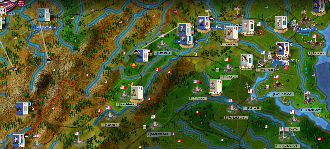 Loose regiments and brigades garrison Western Virginia including the Shenandoah Valley and along with cavalry regiments are ranging through the countryside to reduce the ability of the traitors to spy on those regions.