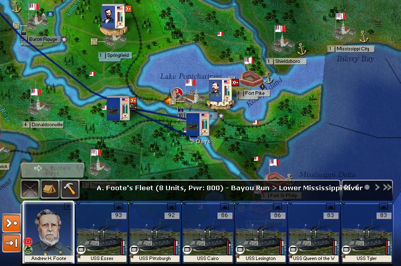 Supply is getting critical for Crittenden. I have a supply fleet steaming down the Mississippi. Tyler has his ironclads just south of New Orleans and Foote will be enganging him. 2 more divisions are in route to Vicksburg. I have to get MC over Pearl, LA in order to open up supply to Crittenden.
