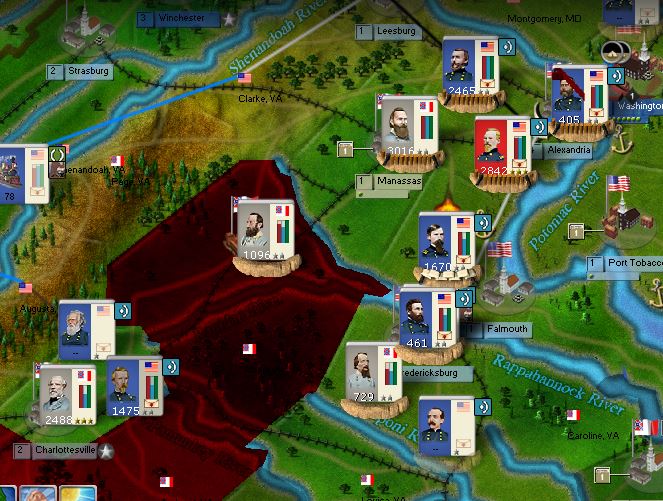 What I do in the east is usually build a couple of iron works, print money and take some inflation and get more numbers against the Rebels. The sweep around Shenandoah usually is enough to push the Rebels out of Manassas and Culpepper. Tyler has developed a strategy to counter this. Note the numbers he has in Manassas, Culpepper and Nelson. Almost 9000 CBT. I have 10,000 CBT in the area, not including 2500 more in Kearny Corp doing the right hook, but his positioning is forcing me to defend Washington, well Alexandria to be exact, so I can't push around as many troops as I like. His position also gives him interior lines so he can quickly shift his forces.