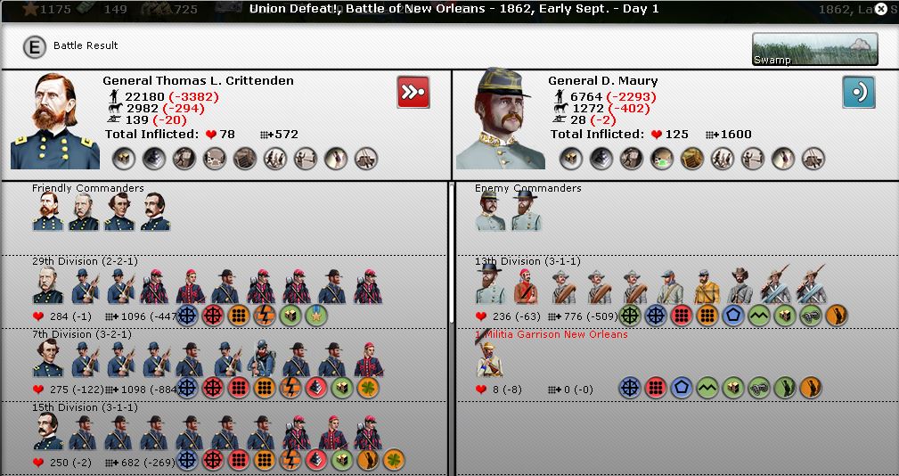 And Polk'force attempted to follow up on Johnston's victory with heavy losses. New Orleans surrendered. That will free up Crittenden's corp for offensive operations. I'm going to leave a division in New Orleans for defense.