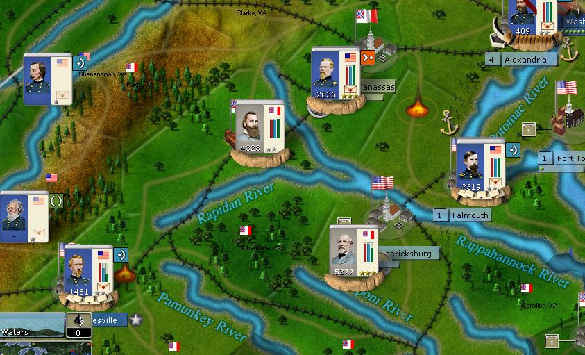 Small stretching works. McDowell and Keys pushed into Manassas. Lewis's Corp supported. In order to maximize the chance for victory in Manassas, I pulled Berry's Corp back from Fredericksburg into Stafford and that was a lucky move as Lee left Kearny alone and rush into Fredericksburg.