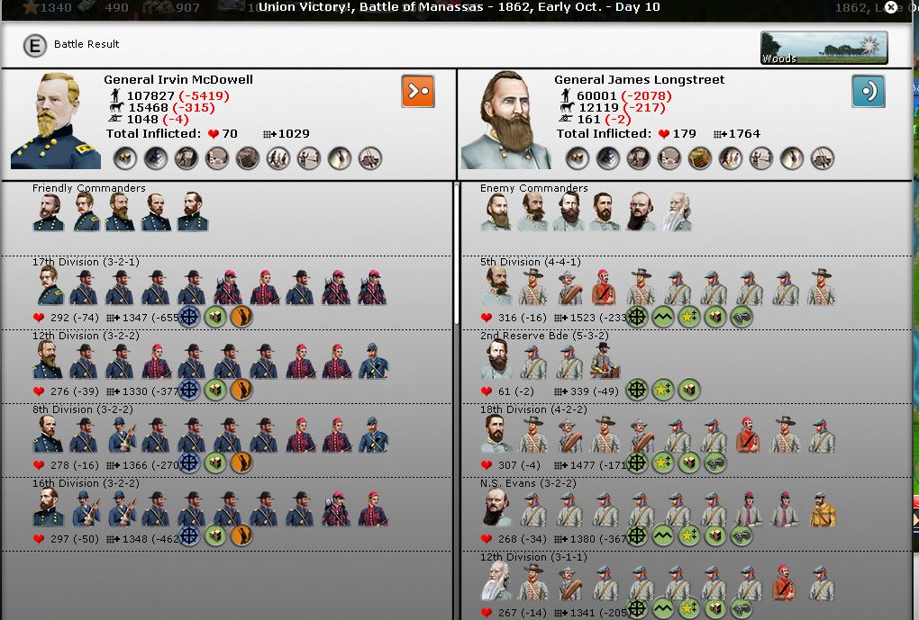 The key to taking Manassas is Nelson. From there, I can cut rails in Albemarle and that removes supply into Manassas and the Rebels have to retreat. Realizing this, Tyler sent Lee to deal with Kearny and won a victory, though he took twice as many losses. I was expecting something, so Kearny was prepared to retreat.