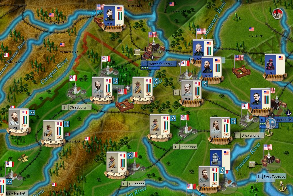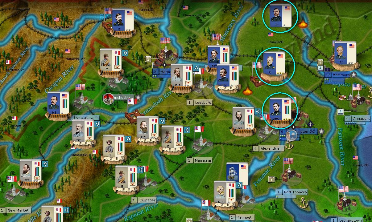 Due to the danger in Northern Virginia (see below) I will not try to reinforce my force there. Anyway, Grayfox should not be able to attack this turn with the troops in Fort Monroe (and I'm still unable to know their strength, given the size of the army in Annapolis they might be not as big as I was suspecting).