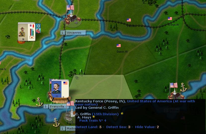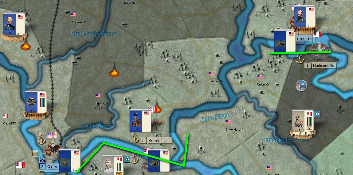 In Kentucky, I'm holding Paducah and Bowling Green and laying siege to Munfordville. Forrest is at Louisville to get more information on the troops holding the city (there is a 500 points force Inside it).