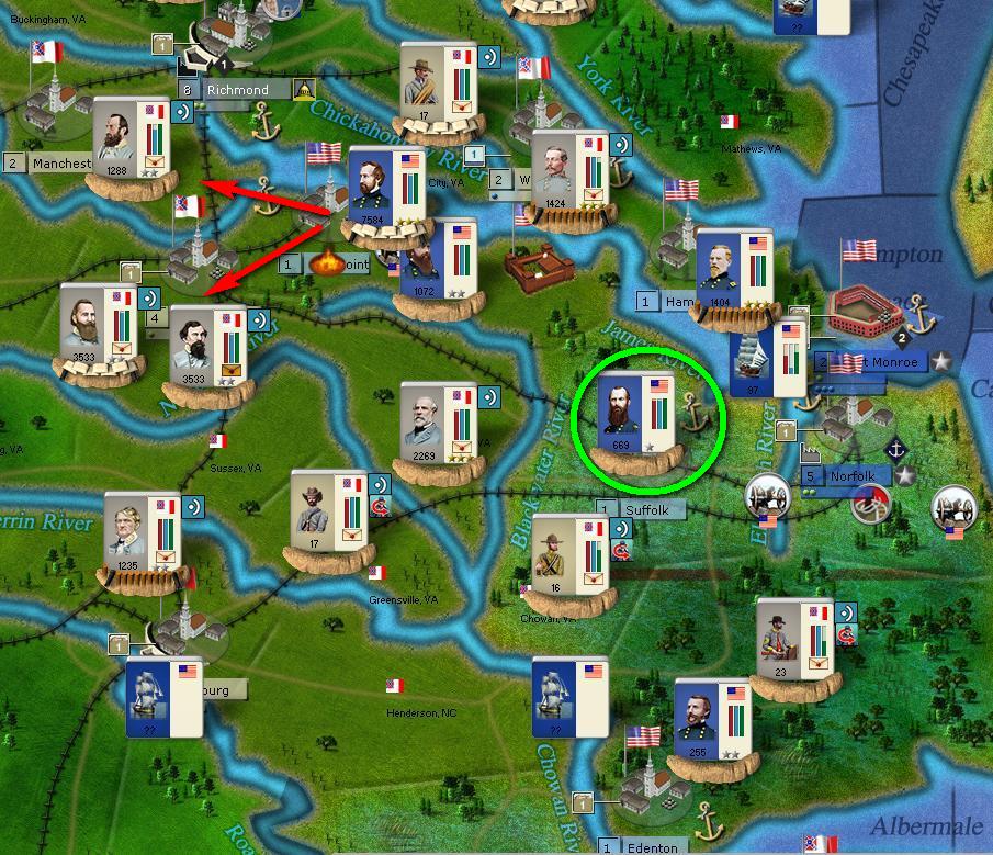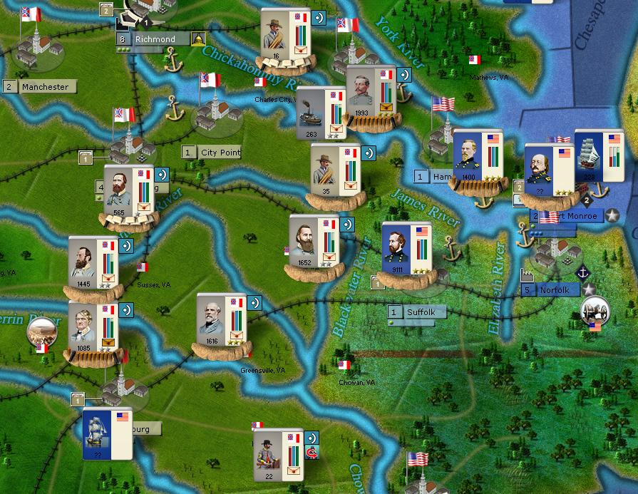 GF is threatening Manchester and Petersburg and has built an outpost in Surry. But there is a weakness in the Union line at Suffolk (and Norfolk is only occupied by a 650 power points force).