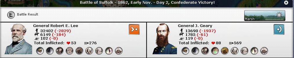 As I was fearing, Lee has been switched to attack mode and two battles ensued in Suffolk. fortunately the MSG with Polk succeeded: