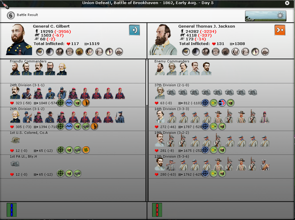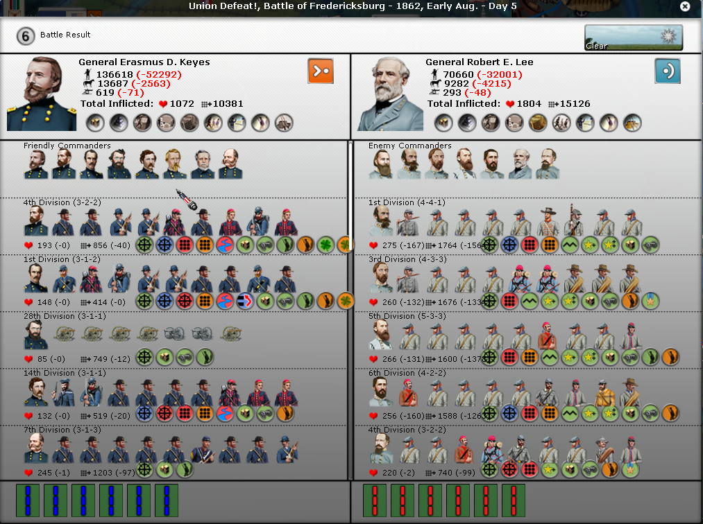 Ripster8 wrote:Only in TEAW have I seen that level of casualties. Like you said, it seems very historically unrealistic. Lee lost over 60% of his entire army in two days, 50,000 men slaughtered! The Army of Northern Virginia had excellent morale but I believe that even they would have broken and routed away long before 60% of them were dead. It would have been perhaps more palatable if they had lost 10-15% in battle and then lost another 10-15% in the pusuit after the battle but the 60% level of casualties puts the Battle of the Somme to shame!