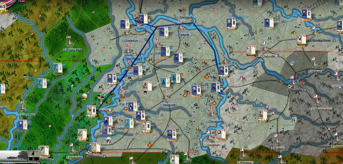 A strong navy from the start, built up with early cottonclads and a solid dose of luck, allowed me to retain control of the Big Muddy and deliver a few hard knocks.