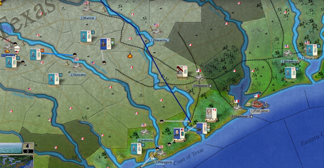 In Texas, tripax again outmaneuvered and outfought me. I ending up holding only Houston and Dallas. Part of the problem was I didn’t send a decent commander to the theater and ended up paying for it in lost battles. I was sure that it would be child’s play to burn the chain of stockades linking the Far West to TX. But, no, tripax was hot on my heels and rushed into the house before I could shut the front door.