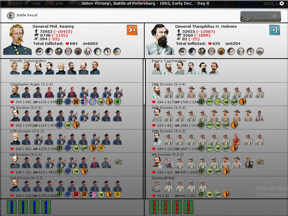 Theater wise performance: in the East, I think the CSA did a good job defending and holding most of central VA. I have to admit, moving the capital to Atlanta was cheesy and not historical. To top it off, I did a poor job threating DC, and looking back, the 3 lines of fall back positions was overkill.